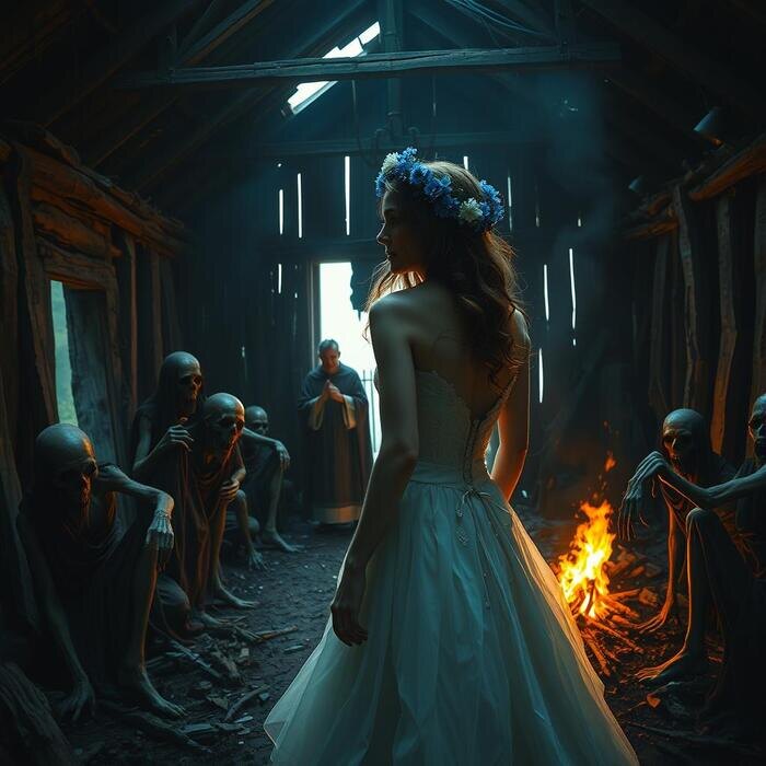 Внезапно раздались звуки – резкие, громовые, ужасающие. Оркестр из мертвецов, прибитых к стенам, заиграл жуткий свадебный марш. Каждый аккорд отдавался эхом в темных стенах, наполняя пространство зловещей какофонией, которая несла с собой неизбежный холод. Мрачная серенада, исполненная тенями прошлого, раскрывала страшные тайны этого места, превращая свадьбу в гротескный ритуал мертвых.