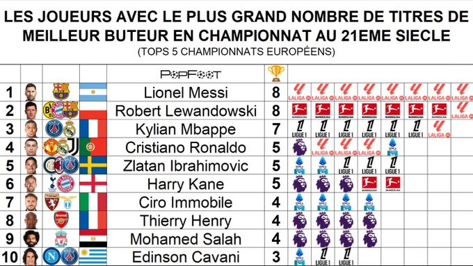 Портал PopFoot провел исследование, кто чаще всего заканчивал сезон с титулом лучшего бомбардира своей лиги. На вершине списка — Лионель Месси и Роберт Левандовски. У каждого по восемь таких сезонов. Месси 8 раз становился лучшим бомбардиром Ла Лиги в составе «Барселоны». Сейчас он лидирует и в гонке бомбардиров МЛС (16 голов), но Сэм Сурридж дышит в спину. Левандовски повторил достижение аргентинца: один раз — за «Боруссию», шесть — за «Баварию», и еще один — уже за «Барселону». В топ-5 также вошли: Килиан Мбаппе — семь сезонов (шесть за «ПСЖ», один уже за «Реал») Криштиану Роналду — пять сезонов (три за «Реал», по одному за «Ювентус» и «Манчестер Юнайтед») Златан Ибрагимович — пять сезонов (три за «ПСЖ», по одному за «Интер» и «Милан») Также в списке фигурируют Иммобиле, Анри, Салах и Кавани, но шансов догнать Месси и Левандовски у них практически нет. Интрига в том, сможет ли кто-то из действующих звезд, помимо Мбаппе, приблизиться к этой отметке.