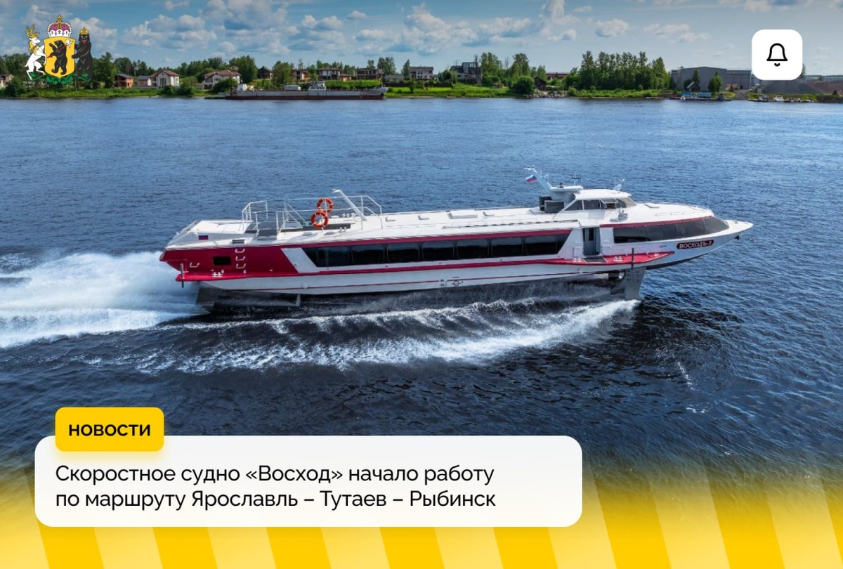 🚢В Ярославской области запустили новый скоростной речной маршрут С сегодняшнего дня между Ярославлем, Тутаевым и Рыбинском начал курсировать скоростной теплоход «Восход». Первый рейс нового судна состоялся с Речного вокзала Ярославля, преодолев расстояние до Рыбинска с остановкой в Тутаеве всего за два часа. Рейсы будут выполняться ежедневно по установленному расписанию. ⚓️ Уже с 1 августа начнет работу дополнительное направление до Толги, которое будет обслуживать современный электрокатамаран «Белояр». Этот экологичный транспорт совершит по четыре рейса в день, обеспечивая комфортное сообщение между населенными пунктами.
