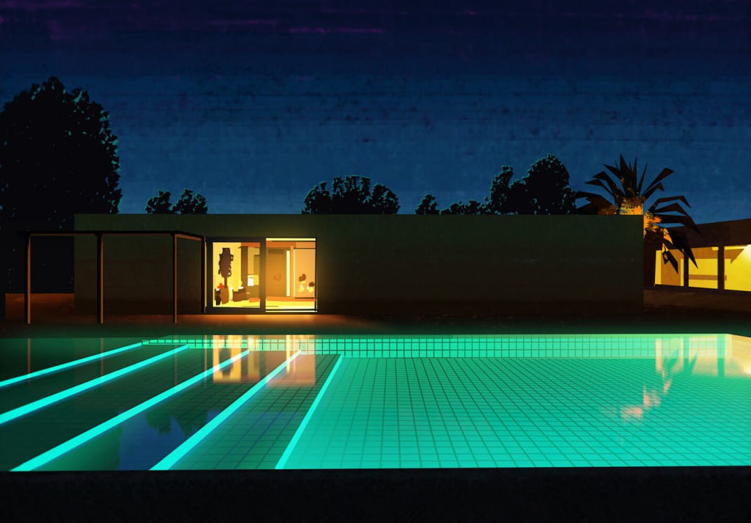 Картина изображает современную архитектуру в ночное время, где внимание фокусируется на бассейне с ярким, зеленым освещением, отражающимся в воде. Линии плитки, создающие четкие геометрические формы, подчеркивают стиль и симметрию композиции. Вдалеке можно увидеть контуры строения с окнами, через которые льется теплый свет, создавая контраст с темной атмосферой ночи. Простота и чистота форм, а также использование ярких контрастов между светом и тенью придают картине особое визуальное воздействие, создавая ощущение спокойствия и уединения. Стили: Современное искусство, Минимализм, Архитектурная живопись, Поп-арт, Геометрический абстракционизм. Автор работы: Генри Вонг, Лондон, Великобритания Картина «Ночной Бассейн» Здесь вы можете наслаждаться картинами современных цифровых художников, которых нет в масс-маркете, и которые можно купить на холсте или бумаге 🤍