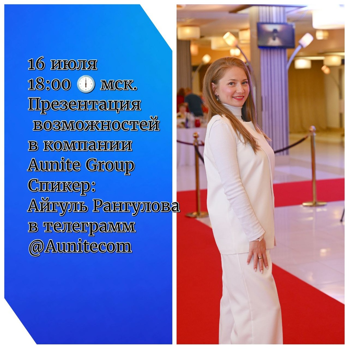 ⏰ 🚀 18:00 🕕 мск. Презентация возможностей в компании Aunite Group Спикер: Айгуль Рангулова (в телеграмм @Aunitecom https://dzen.ru/id/659abcf7f79ef86dc164c6c8