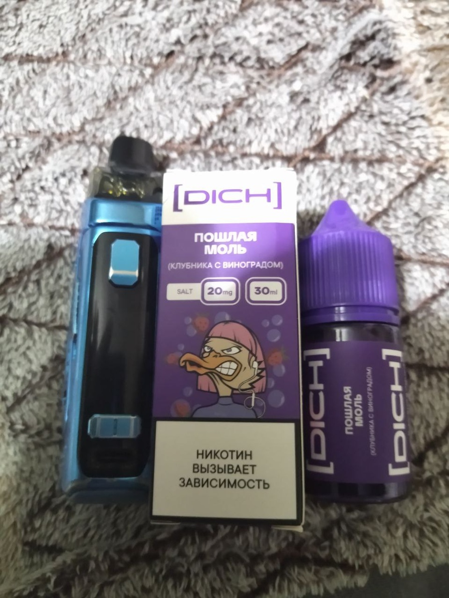 Жидкость для ЕСДН DICH со вкусом виноград/клубника Жидкость от [DICH] - Пошлая Моль, со вкусом - клубника с виноградом🍓🍇 Упаковка и флакон имеют прикольный/интересный дизайн преимущественно бело-фиолетового цвета, объем флакона 3️⃣0️⃣ мл. и запечатан в пленку (значит 1️⃣0️⃣0️⃣% до меня никто её не открывал🧐), также присутствует вся необходимая информация ❤️ Крепость 20 мг. HARD и это абсолютная правда👍 При открытии чувствуется запах тёмного винограда и немного клубничной сладости😋 При вдохе больше чуствуется виноград с какой-то непонятной сладкой примесью, которая после выдоха становится похожа на клубничку, а в конце на языка остаётся чётко выраженный вкус клубники с малой долей винограда, также в ротовой полости ощущается освежающий эффект, похожий на кулер, но совсем в малой степени😊 Личный вывод: Жидкость в меру сладкая и с достойной крепостью, также ещё раз хотелось бы отметить внешний вид👍👍👍 Ребята из команды DICH очень грамотно подошли к созданию этого продукта