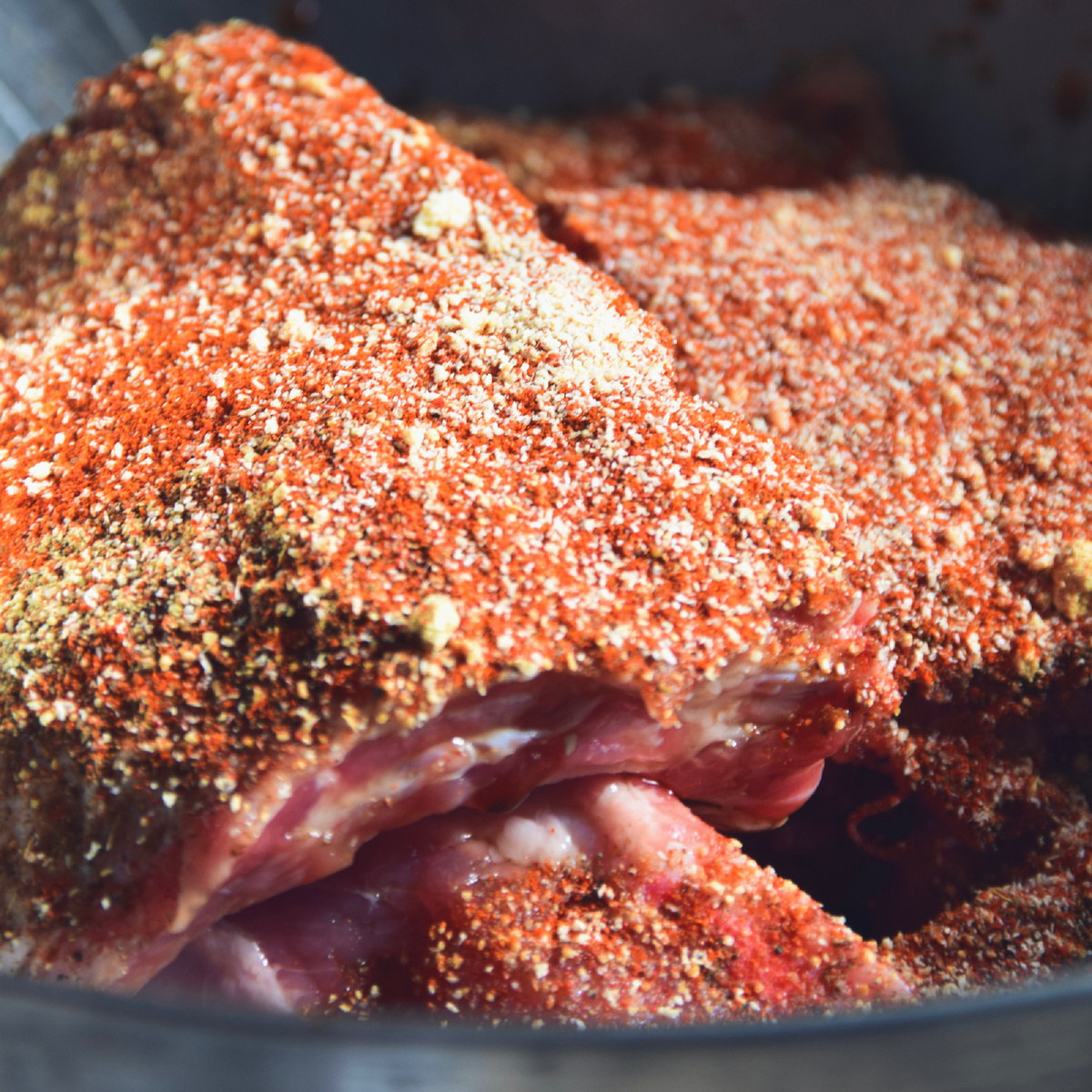 Блюда ресторанного уровня можно приготовить из самых обычных продуктов даже в домашних условиях. Для этого нужно выбрать качественные ингредиенты и правильно сочетать их между собой. При выборе такого капризного и скоропортящегося продукта как мясо, стоит обратиться в фермерский магазин к проверенному продавцу. Мясо из супермаркета зачастую содержит консерванты и влагоудерживающие компоненты, что не лучшим образом влияют на вкус блюда. Я купил пару хороших свиных отрубов рёберного отдела общим весом 1 килограмм. Мясо предварительно нужно приправить и выделить время на маринование. Для каждого продукта существует особая пряная смесь, что в полной мере раскрывает его вкус и дополняет аромат. Мясо, в данном случае свинина, тому не исключение. Я подобрал особую смесь пряностей, что на мой скромный взгляд удачно сочетается со свиными рёбрами в около-bbq стиле. В кофемолку для специй отправились: Паприка подарит блюду пикантность и подчеркнёт сладость; лук и чеснок добавят глубины вкусу; роз