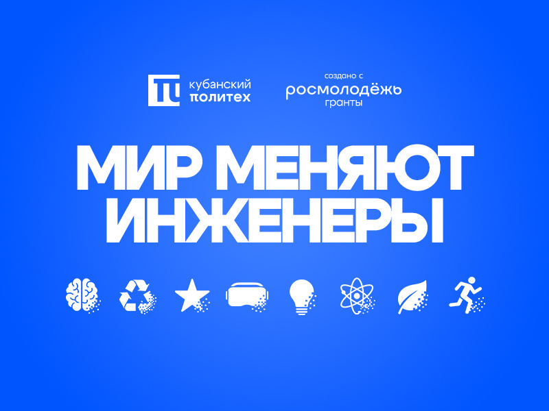 Кубанский государственный технологический университет стал победителем Всероссийского конкурса молодёжных проектов среди образовательных организаций высшего образования, проводимого Федеральным агентством по делам молодежи (Росмолодёжь). В рамках конкурса университет получил грант в размере 19,4 млн рублей на реализацию проекта «Мир меняют инженеры» . Данный проект является частью программы развития молодёжной политики Кубанского государственного технологического университета в нескольких направлениях: развитие студенческого самоуправления, научно-технического творчества молодёжи, экологической культуры, физическое воспитание и здоровье-сбережение. Проект включает в себя 8 проектных решений: 1. Проектное решение «ЭкоДобро» Цель — повышение экологической культуры студентов путём проведения образовательных, творческих и практических мероприятий. Планируется охват 520 обучающихся КубГТУ. 2. Проектное решение «Созидай» Экологический марафон, направленный на вовлечение школьников, студентов