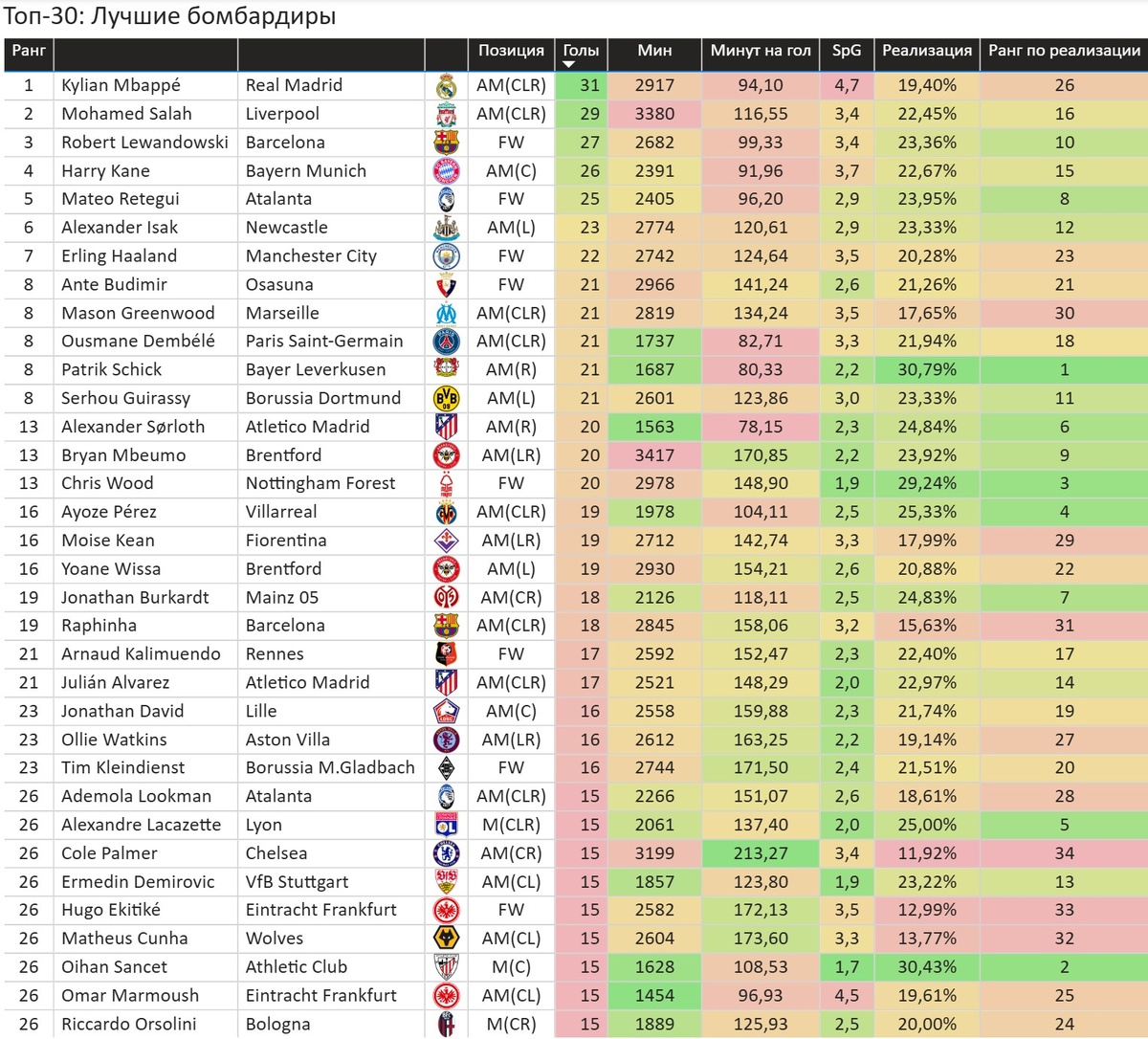 Лучший бомбардир в топ-5 лигах – Килиан Мбаппе («Реал Мадрид») с 31 голами, такой успех объясняется в немалой степени рекордным показателем ударов за игру (SpG – 4.7), по реализации (процент голов от всех ударов) Килиан только на 26 месте. Самые точные: Патрик Шик («Байер Леверкузен») – 30,79% реализации из удара в гол и Ойан Сансет («Атлетик») – второй по реализации (30,43%), несмотря на позицию полузащитника.