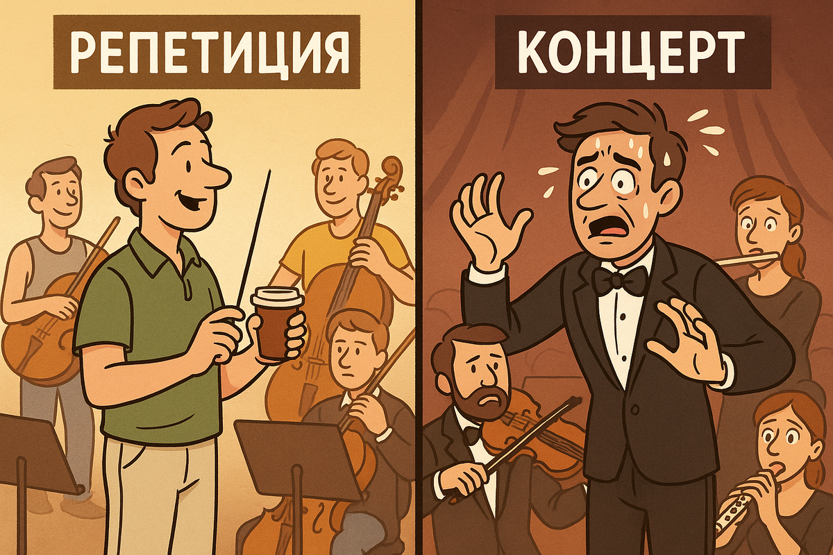 «Репетиция — это когда в зале жара, музыканты в шортах и всё звучит потрясающе. Концерт — когда все в смокингах, а вступление ушло в соседнюю тональность.»