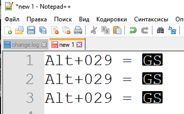 (Решение) Не отображается нажатие Alt + 029 в Notepad++ символа GS
