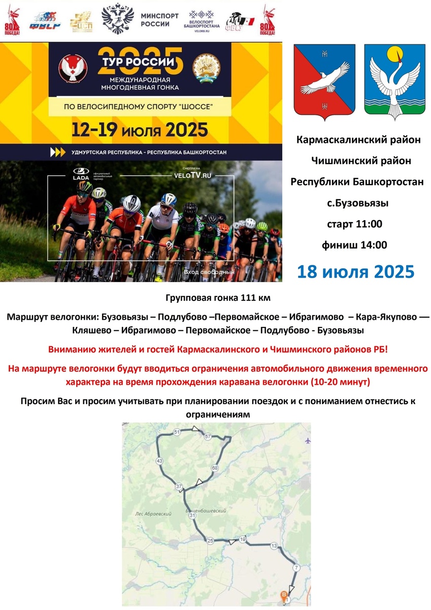 С 11 по 19 июля 2025 г. по шоссейным и гравийным дорогам Республики Башкортостан и Удмуртской Республики проводится международная многодневная велогонка «Тур России» с участием сильнейших спортсменов – велосипедистов из России, Казахстана и Республики Беларусь. Этапы в Республике Башкортостан: 17.07.2025 - Чишминский район РБ, дистанция 160 км, старт в с.Кляшево в 11:00; финиш в с.Кляшево в 14:30. С 11:10 до 14:00 – детские заезды по улицам села Кляшево Место парковки для зрителей: с.Кляшево, ул. Центральная 18.07.2025 - Кармаскалинский район РБ, дистанция 111 км, Чишминский район РБ, старт в с.Бузовьязы, в 11:00; финиш в с.Бузовьязы в 14:00 С 11:10 до 14:00 – детские заезды по улицам села Бузовьязы Место парковки для зрителей: с.Бузовьязы, ул. Карла Маркса 19.07.2025 - г.Уфа, дистанция 120 км., ул.Комарова, Парк Победы, старт в 10:00, финиш в 13:00 Место парковки для зрителей: г.Уфа, ул. Интернациональная, ул.Мира Приглашаем зрителей, любителей велоспорта поболеть за участников велого