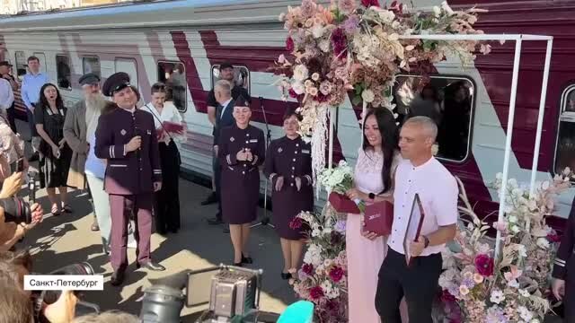 Отель на колесах отмечает фарфоровый юбилей. В Петербурге представили обновленный состав поезда «Гранд Экспресс». На праздник на Московском вокзале заглянули Александр Пушкин, Владимир Маяковский и Лев Толстой. Подробнее расскажет корреспондент ЛенТВ24 Евгений Голанцев. Ох, какая форма-то красивая, посмотрите. О, один другого краше. Похожа на форму, которая была у англичан при обороне Севастополя. Я ж там был. Очень похожа. Не сбавляй обороты, не знай преград! Вперед, машинист, ты мой друг и брат! К сожалению, я сегодня без супруги, один. Она не смогла, она на другом мероприятии, отпустил ее вольно, сказал: гуляй, моя дорогая. Но я не мог пропустить этот праздник. Поэтому сегодня я здесь. Актеры создавали праздничную атмосферу. Юбилейную дату решили отметить масштабно: прямо у поезда располагалась цветочная арка — около нее поздравления получили семейные пары. Одни супруги отметили фарфоровую свадьбу — 20 лет вместе. Инна и Максим Храповы в браке меньше, но история их знакомства неразр