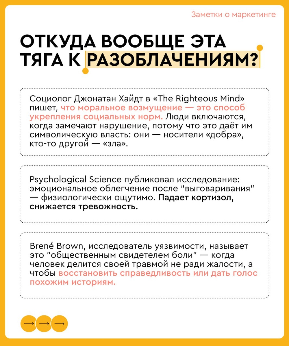 Почему людям хочется разоблачать и разоблачаться — феномен публичного катарсиса // немного исследований сегодня Если вы когда-нибудь писали пост про токсичного начальника, про то, как не заплатили за работу, или делали разоблачение курса/компании/личного бренда — вы уже были внутри этого процесса. Это не про месть и не только про справедливость. Это — про очищение. Публичный катарсис. 📍Через обнажение — своего опыта или чужой неправды — люди получают облегчение, внимание, подтверждение своей правоты и, главное, чувство контроля над ситуацией. При чём тут маркетинг? Потому что сегодня бренды — такие же участники дискурса, как и люди. Если вы хотите, чтобы вам доверяли — будьте слышащими. И говорящими. 📎 Выигрывают не те, кто «никогда не ошибается». А те, кто умеет признать ошибку, объяснить позицию, показать, как они меняются. Уязвимость становится стратегическим активом бренда. И если её нет — в ход идут скриншоты, анонимные посты, комментарии. Всё, что бренд не сказал сам, с
