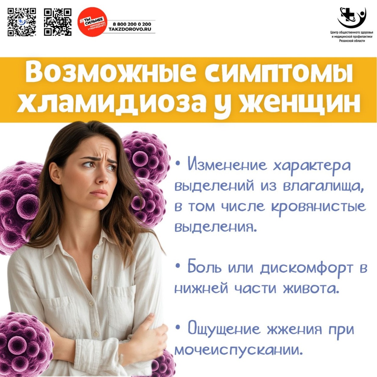 🔔 Идет Неделя профилактики ИППП! Хламидиоз у женщин: скрытая угроза для здоровья 🌡 Возможные симптомы: 1⃣ Необычные выделения • Желтоватые/слизистые • С неприятным запахом 2⃣ Болевые ощущения • Внизу живота • При мочеиспускании • Во время секса 3⃣ Кровотечения • Между менструациями • После полового акта 4⃣ Другие признаки • Зуд во влагалище • Повышенная температура ⚠ Особенности хламидиоза у женщин: → В 70-80% случаев протекает БЕЗ симптомов → Без лечения вызывает: • Бесплодие (из-за непроходимости труб) • Внематочную беременность • Хронические тазовые боли 🧪 Как выявить? ✔ ПЦР-анализ (мазок из влагалища/шейки матки) ✔ ИФА крови 💊 Важно знать: → Лечиться должны оба партнера одновременно → Курс антибиотиков назначает только врач → Повторный анализ — через 3-4 недели после лечения #ЖенскоеЗдоровье #Хламидиоз #ПрофилактикаИППП #Здоровоебудущее62 #ЗдороваяРязань