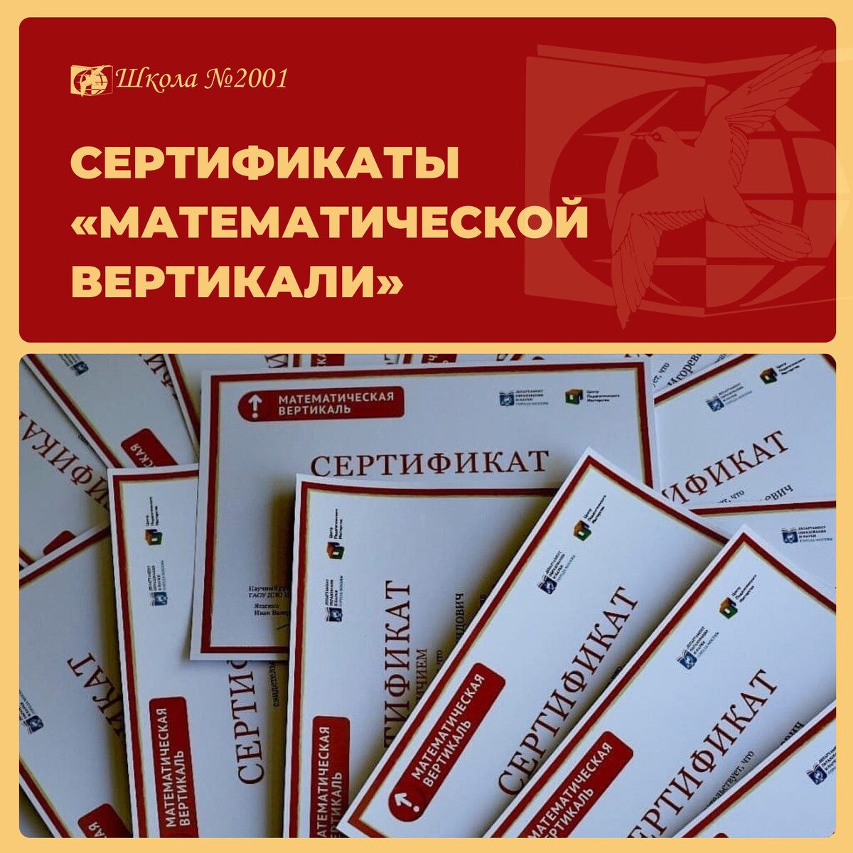 🎉 Ученики 9 и 11 классов, которые участвуют в проектах «Математическая вертикаль» и «Математическая вертикаль ПЛЮС», получили сертификаты! 🌟 В этом году ребята выполнили все условия программ и получили: в «Математической вертикали» — 21 обычный сертификат и 1 с отличием, а в «Математической вертикали ПЛЮС» — 12 обычных и 1 с отличием! Поздравляем с достижением! 👏 #ДОНМ #Школа2001 #Предпрофкласс