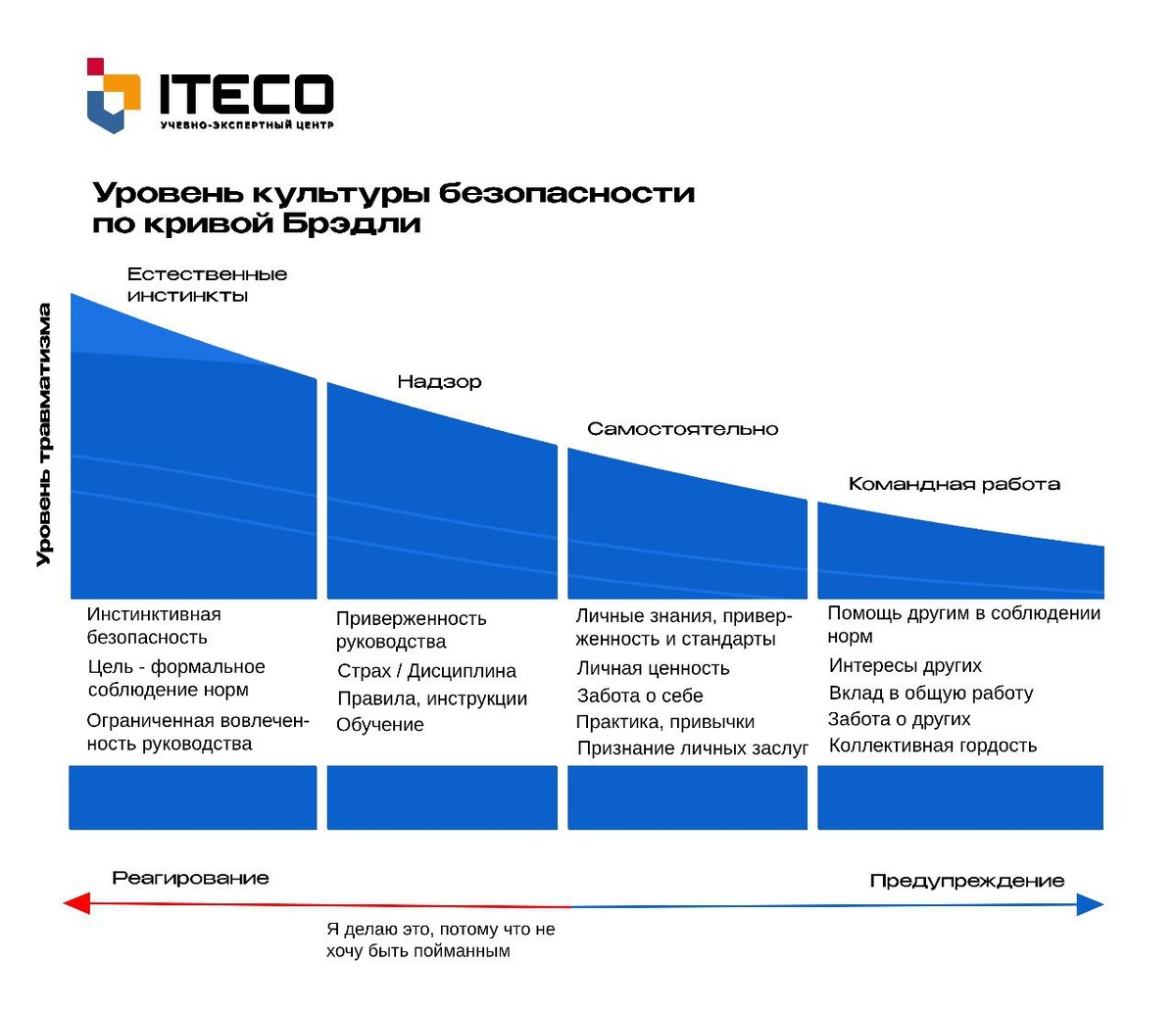 📉 Кривая Брэдли – это инструмент, который визуально демонстрирует и помогает оценить уровни культуры безопасности в компании. Данная модель создана в конце ХХ века сотрудником компании Дюпон. Она иллюстрирует четыре стадии развития компании: 1⃣ Стадия реагирования. Сотрудники не берут на себя ответственности и уверены, что несчастные случаи невозможно предотвратить. 2⃣ Стадия зависимости. Сотрудники считают, что безопасность заключается в следовании определенным правилам. Количество происшествий уменьшается. 3⃣ Стадия независимости. Сотрудники берут на себя ответственность и осознают, что могут изменить ситуацию своими действиями. Количество происшествий значительно снижается. 4⃣ Стадия взаимозависимости. Команды проявляют реальную заинтересованность и чувствуют ответственность за культуру безопасности. Они убеждены, что любое происшествие можно предотвратить. Подробнее о данном инструменте и том, что мешает повысить культуру безопасности в компании, читайте в нашей статье.