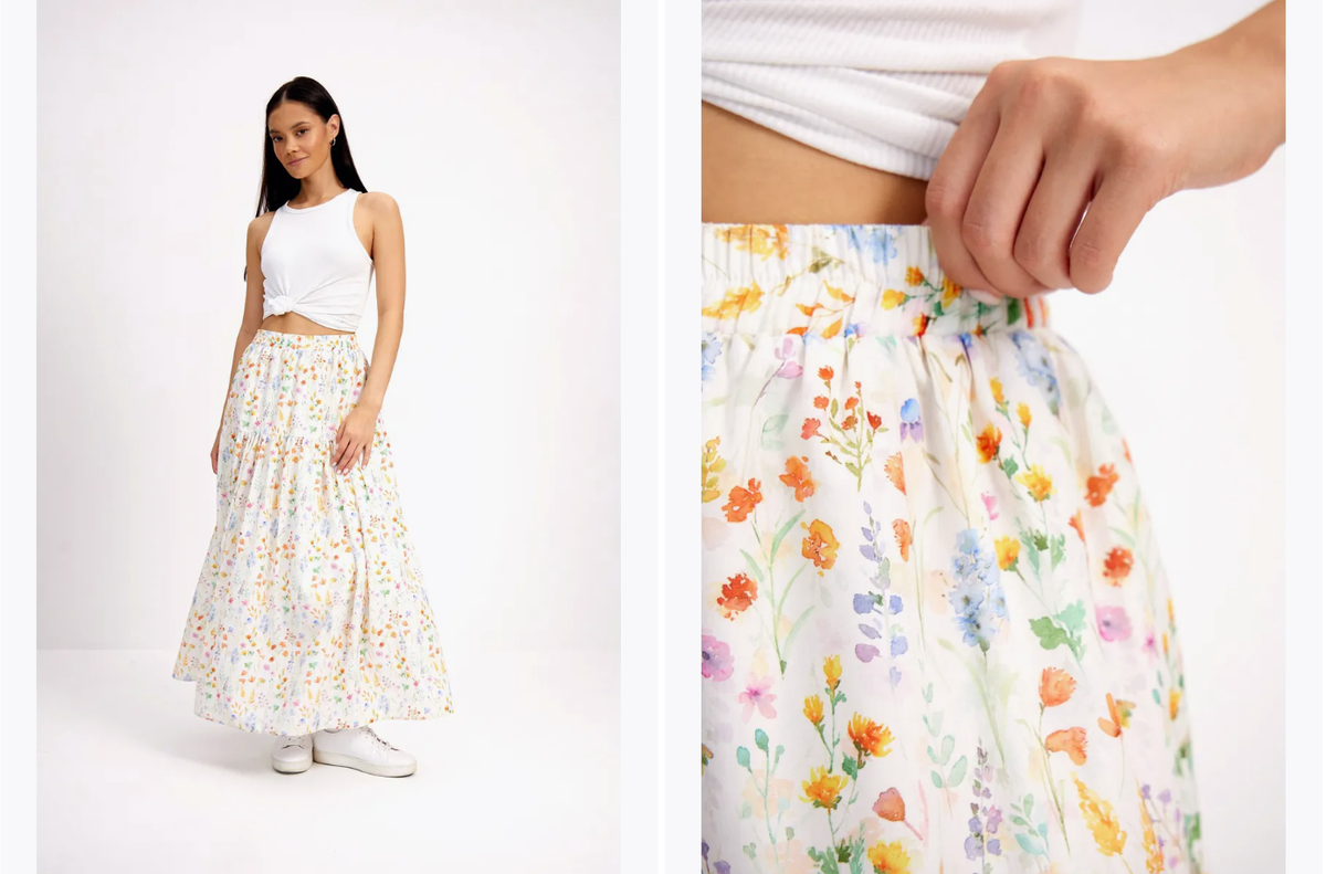 Атмосфера ретро, бохо и женственности. Цветочный принт и отрезная кокетка делают эту юбку визуально стройнящей, а мягкий хлопок приятно ощущается на теле даже в жару. Отличный выбор, если хочется лёгкости, но с изюминкой.