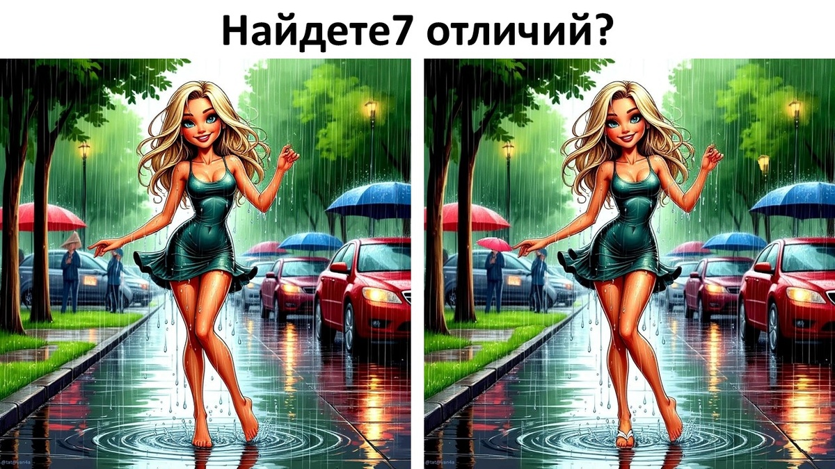 Красивая блондинка под дождем. Смотреть приятно. А если еще и отличия на картинках отыщите - вообще супер! Тут их 7. Некоторые очевидны. Чтобы отыскать другие - придется постараться. Особенно одно хитро спрятано. Задание 1. Первый уровень сложности: суметь найти все 7 отличий. 2. Второй уровень -найти эти отличия за 7 минут. Слабо? Время пошло! ⏳ Кому-то проще сравнивать две большие картинки. Кому-то - картинки, стоящие рядом (двойные). Имеются обе возможности. Если увеличить рисунок, то искать отличия вам будет проще. Тут детали виднее. Но придется переключаться и дольше держать в памяти информацию. Где-то тут спрятаны 7 отличий. Отыщите их! Замечать мелочи — значит видеть мир на все 100%. Это не просто тренировка для ума, но и полезный навык в повседневности: от быстрого поиска потерянных ключей до внимательного изучения документов. Развивайте наблюдательность — и ни одна важная деталь не останется незамеченной! (P.S. Если не нашли всё — попробуйте снова. А если справились бе