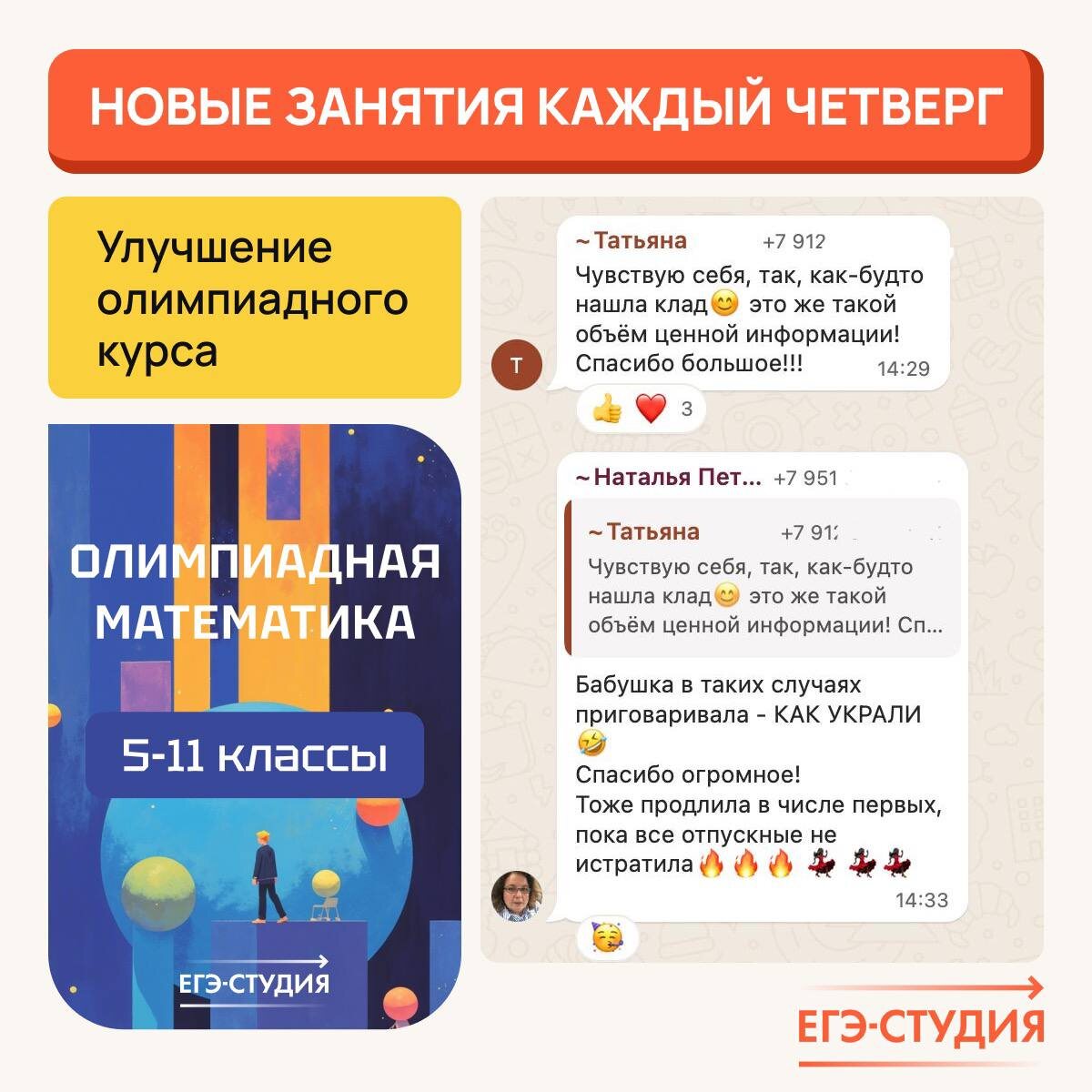 Удваиваем количество занятий на олимпиадном курсе *️⃣2️⃣ Теперь встречаемся каждый четверг В 25-26 учебном году курс нацелен на подготовку к трем основным олимпиадам: Физтех, Росатом, Шаг в будущее. Каждая из олимпиад имеет своё лицо, свой особенный стиль задач, и если планируете получить диплом такой олимпиады, то к её стилю надо привыкнуть, чтобы в результате быстрее найти ключ к решению. Почему выбраны именно эти три олимпиады? 1. Олимпиады наиболее популярных технических университетов: МФТИ (олимпиада «Физтех), МИФИ («Росатом») и МГТУ им. Баумана («Шаг в будущее»). В эти вузы стремится поступить большинство школьников, желающих участвовать в олимпиадах по математике (по статистике обращений к нам). 2. Перечневые олимпиады: «Физтех» и «Росатом» имеют в перечне РСОШ 2-й уровень, «Шаг в будущее» — 3-й. Льготы данных олимпиад, полезны для абитуриентов многих других вузов, вплоть до МГУ и Вышки. 3. Олимпиады доступны среднестатистическому школьнику. Наш опыт показывает, что прощ