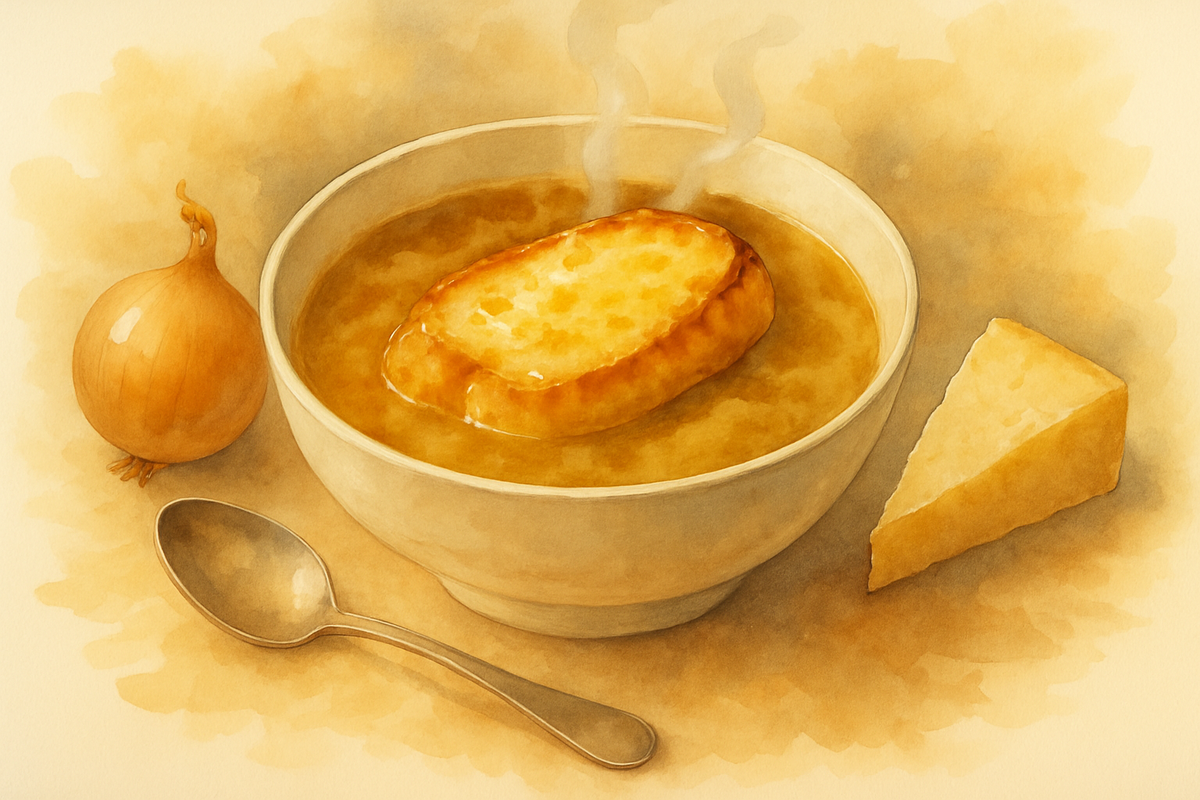 Традиционно французский луковый суп (La Soupe a l'Oignon) — это блюдо бедняков, основанное на одном простом, распространённом ингредиенте, доступном практически везде: луке. Лук обжаривают на небольшом количестве жира (сливочного масла, растительного масла или свиного сала, в зависимости от региона), до мягкости и полупрозрачности, иногда до тёмно-золотистого цвета. Затем мягкий лук томят в воде (в некоторых вариантах в овощном или бульоне из мяса/птицы), приправляя солью и перцем, получая лёгкий, но ароматный бульон. Этот бульон, насыщенный тающим во рту луком, посыпают "крутонами" из остатков чёрствого хлеба, обжаренными на гриле или поджаренными на большом количестве жира. Для среднестатистической французской семьи он и по сей день остаётся тем же, чем и изначально: лёгким, дешёвым, сытным, домашним блюдом. В отличие от множества рецептов, которые можно найти в американских кулинарных колонках, кулинарных книгах и книге Джулии Чайлд «Осваивая искусство французской кухни», французский луковый суп не нуждается в приукрашивании, чтобы быть потрясающим, с добавлением изысканных, более дорогих ингредиентов. Это настоящая еда для комфорта.