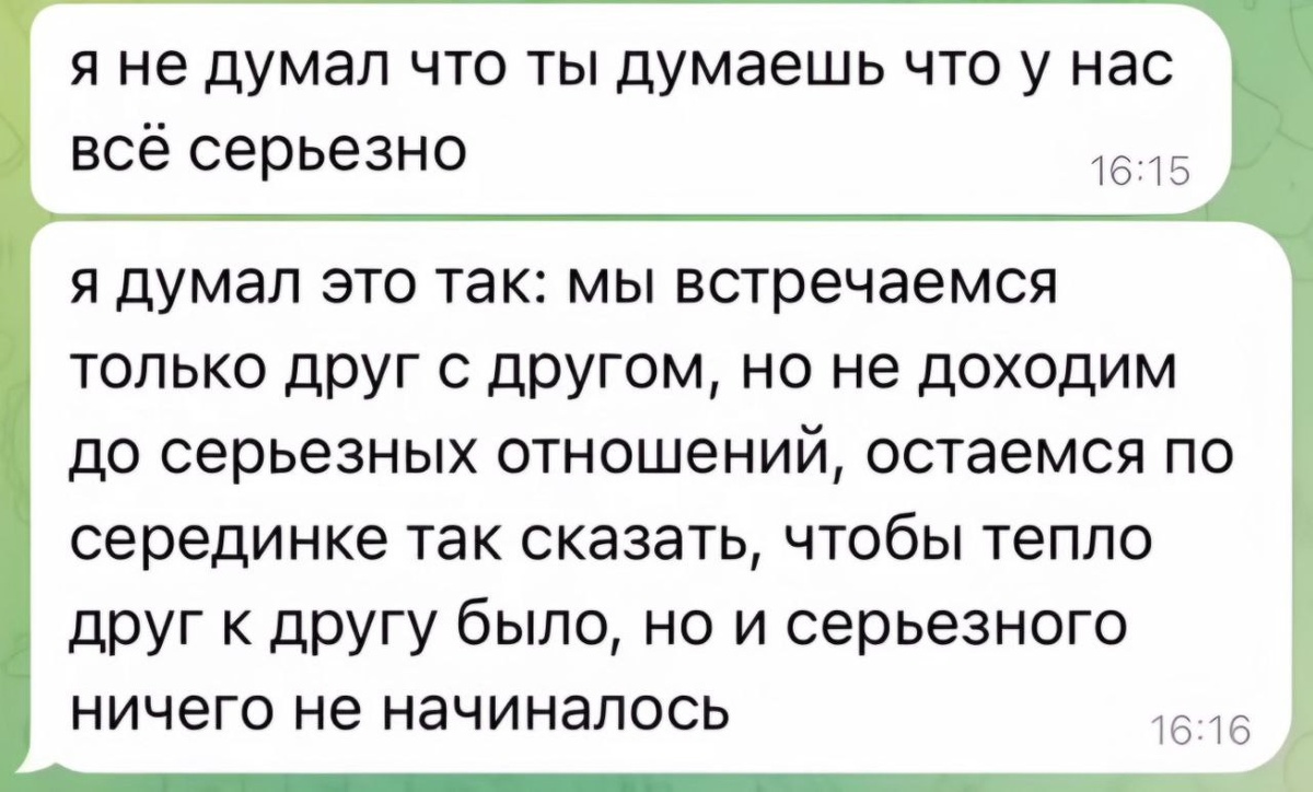 FWB (Friends with Benefits) или «друзья с привилегиями». Это когда есть и романтика, и близость, и красивые слова, и даже букеты... но никаких серьёзных отношений. По сути: все удовольствия отношений, но без ответственности за них. Почему девушки на это соглашаются? • Надежда: «Со временем он передумает и захочет серьёзного» • Страх одиночества: лучше хоть что-то, чем ничего • Низкая самооценка: «А вдруг больше никто не захочет?» • Иллюзия близости: кажется, что вы особенные друг для друга Почему парням это удобно? • Все плюсы отношений без обязательств • Не нужно знакомить с родителями • Нет давления по поводу будущего • Можно в любой момент «соскочить» • А самое «прекрасное» — некоторые так встречаются одновременно с несколькими девушками Что тут сказать... гениально! 🤷 Как не попасть в эту ловушку? 🚨 Главное правило: обговаривать статус отношений В САМОМ НАЧАЛЕ. Если ответ вам не нравится — НЕ СОГЛАШАЙТЕСЬ! Не думайте «ну передумает же потом»... Спойлер: не передумает. Я бы таких