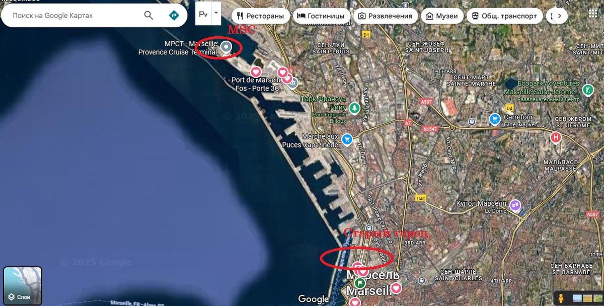 Порт в Марселе оказался самым неудачным в плане расположения от города. Добраться на общественном транспорте в принципе нереально. Паромы MSC паркуются в Марселе в самом дальнем терминале. Путь пешком около 5км, если дойти в принципе возможно.