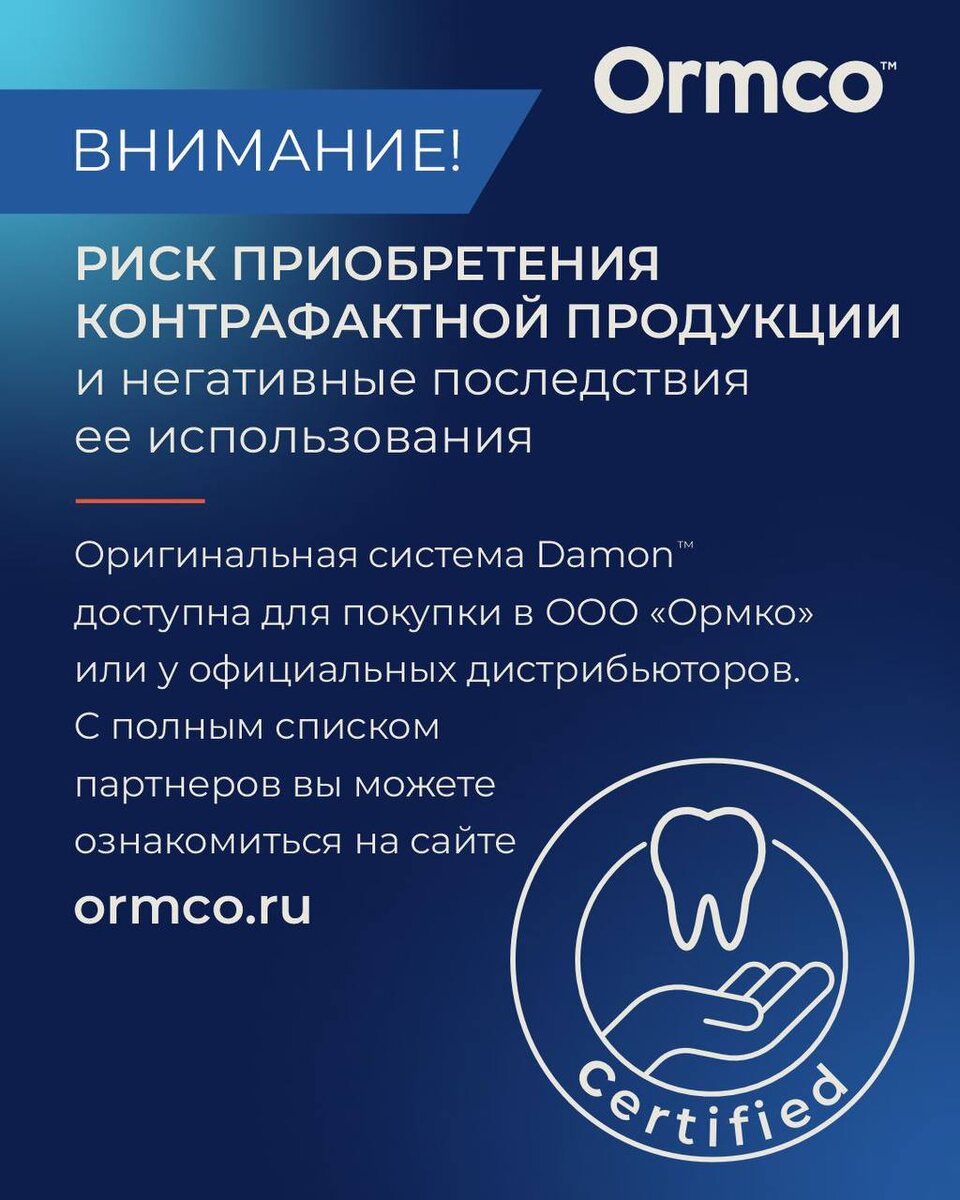 Внимание❗️ Возможен риск приобретения контрафактной продукции Damon™, что может повлечь за собой негативные последствия для пациентов и врачей. 💙Оригинальную систему Damon™ можно купить только у ООО «Ормко» или официальных дистрибьюторов. Проверьте список сертифицированных партнёров на сайте 👉 ormco.ru Будьте внимательны при выборе источника закупки! С заботой о вас, Ormco 💙