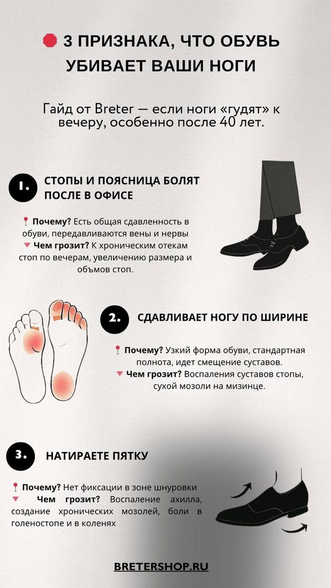 Вы тоже замечали, что даже дорогая готовая пара обуви может натирать? 📍 Всё вроде бы правильно: ✔️ кожа — мягкая, ✔️ бренд — известный, ✔️ посадка — в магазине казалась нормальной. Но через пару часов: — мизинец просит пощады, — пятка сбивается, — колени ноют как после похода. В Breter мы часто разбираем такие случаи. Причина — в колодке и геометрии, а не в цене. Обувь не учитывает форму вашей стопы, а значит — создаёт хроническое перенапряжение. Мы подготовили гайд с 3 признаками, по которым можно понять: ваша обувь работает на вас или против ваших суставов? Что делать? Проверить свою обувь по этим трём пунктам — и не мириться с болью. Мы в Breter создаём пары, которые работают вместе с телом, а не против него: ✅ индивидуальная колодка ✅ точная посадка ✅ поддержка суставов ✅ комфорт, который чувствуется всем телом 📩 Хотите узнать, где именно вас подводит обувь? Напишите нам. Мы разберём пару по точкам и предложим решение.