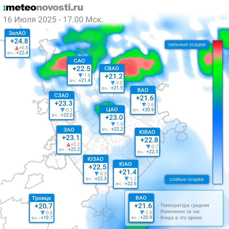 В 17:00 в Москве было от +18.8°C до +25.9°C, средняя температура +22.5°C #погода #Москва #лето #температура #16июля #среда Перейти на сайт Прогноз погоды на 14 дней