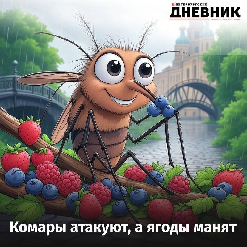 🦟 Комары, клещи и ягоды: что ждёт петербуржцев на следующей неделе Лето в Петербурге обещает быть жарким не только по погоде, но и по активности комаров, клещей и слепней. Комары любят стоячую воду для кладки яиц, а клещи становятся опаснее при температуре выше +12 С. Чтобы защититься, надевайте закрытую одежду, используйте репелленты и проверяйте себя после прогулок. Лайфхак: приклейте двусторонний скотч на края одежды — клещи застрянут. Но есть и хорошие новости: леса полны ягод! Земляника уже зреет, черника скоро станет сладкой, а морошка порадует в конце июля. Фото: сгенерировано нейросетью Петербургский дневник