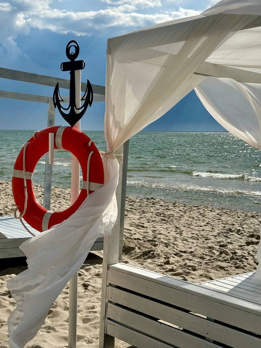 В этом году пляж возле волейбольной площадки (в конце променада) стал меньше на пару метров. Непривычное зрелище для широченных пляжей Янтарного. Стоимость большого лежака с навесом летом 2025 года (фото 1) – 5000 ₽/день.
