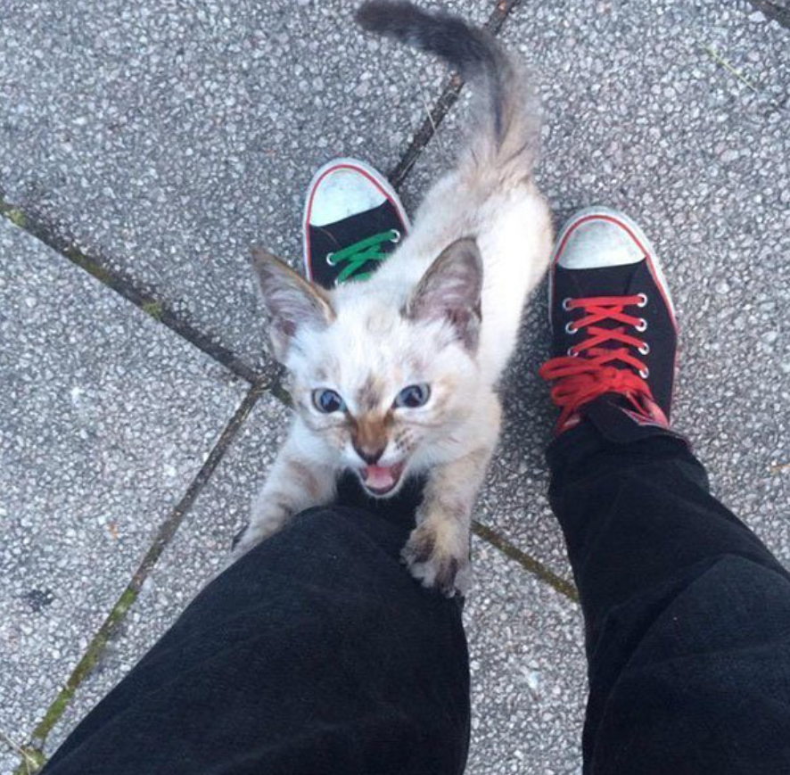 Котенок добрался до колена, остановился и посмотрел на парня так, словно говорил: "Ну что, понял намек?"