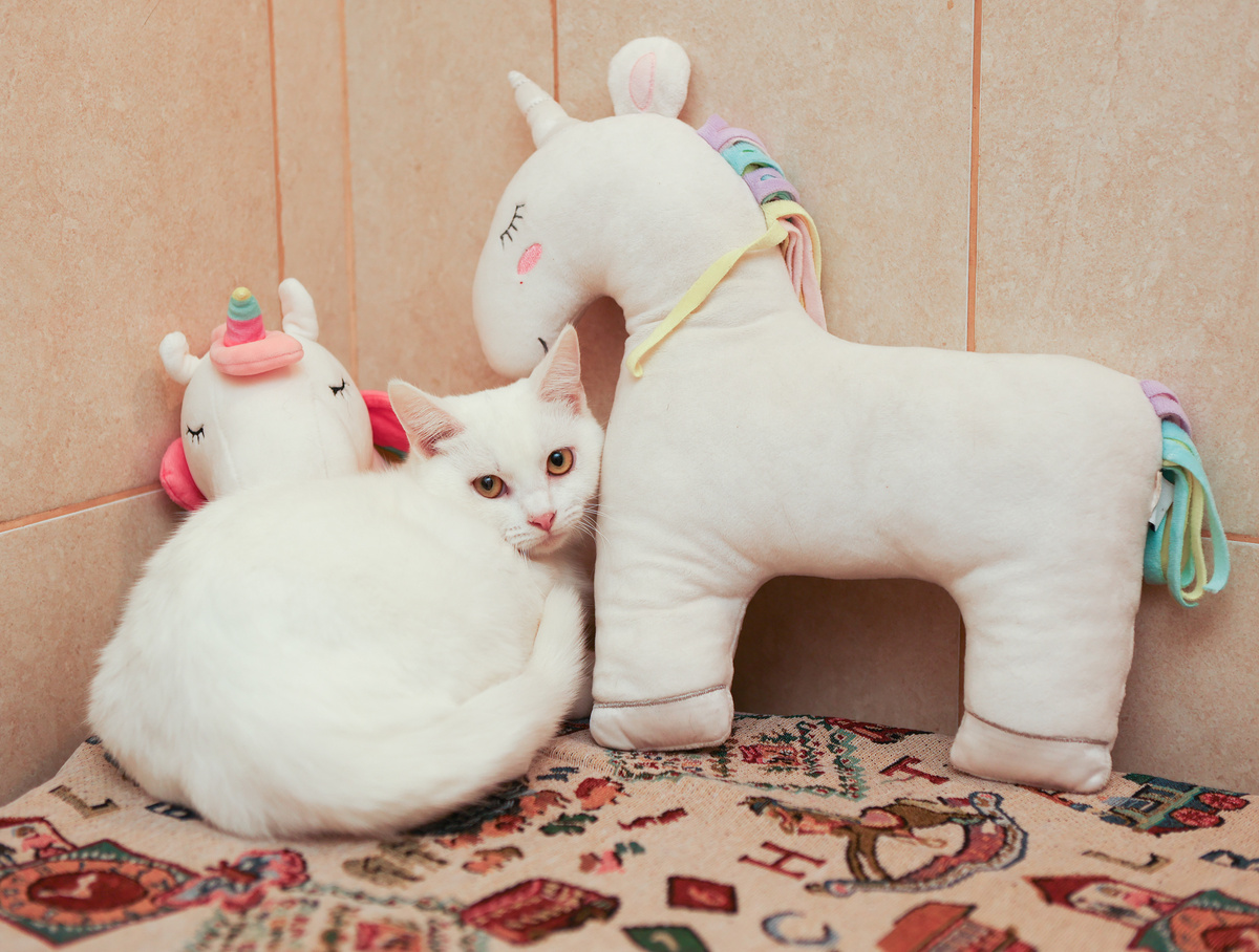 Когда мы ещё держали на карантине котят с дач и вызвали фотографа, почти все вышли на приманку, скакали, прыгали и позировали. Кокоса откопали, и получилось три одинаковых фотографии, где он, лёжа, словно молился своему кошачьему богу. Пришло время, и мы выпустили их в прайд. Кокос, конечно, повеселился от души в первые дни, скакал везде. А потом к нам заглянули гости. Кого-то, естественно, как всегда, сдуло ветром, заодно и Кокоса прихватило. Схоронился он тогда в таких местах, что даже найти не могли. Но совсем недавно к нам снова приходила гостья. Все по схеме, только, видимо, те, кто по привычке сбегал от гостей, лишнюю шапку-невидимку прихватили, и Кокосу она не досталась. Растерялся Кокос и притих за углом. Мы пока с гостьей болтали, даже внимания не обратили, что тут рядом белый кот ошивается. У нас же их, если что, два: кот и кошка — Базилио и Бэлла. А потом пригляделись и ахнули! Кокос, как ни в чём не бывало, ходил туда-сюда. И выдохнули мы так громко и натурально, что и гост
