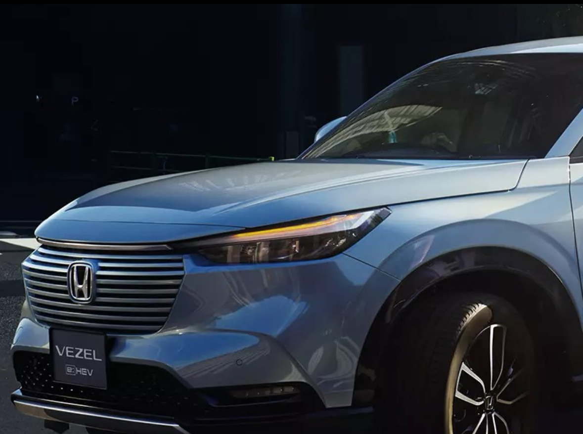Мордочка аккуратная, с узкой светодиодной оптикой, решётка радиатора — в стиле Honda последних лет: с горизонтальными ламелями, чуть приплюснутая. Если не вглядываться — можно спутать с последним HR-V, потому что Vezel — это он и есть, только для японского рынка.