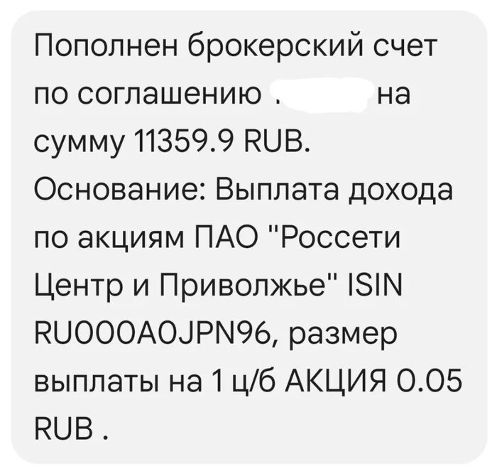 Сегодня утром поступили очередные долгожданные дивиденды от доски ФСК Россети компании Россети ЦП (на брокер ВТБ Инвестиции). Дивиденд 0.050215р, дивидендная доходность 11,09%. (прошлый год 0,03883р, дивидендная доходность 13,26%) В соответствии с моей долей в компании (260000акций))), мне причитается 11358,633 рублей очищенных от налогов. Моя средняя по бумаге, 0,2662, моя личная дивидендная доходность 18,86%. Однако, должен предостеречь, что такие, весьма неплохие, на мой взгляд, дивиденды, компания выплачивала далеко не всегда. Если вдруг надумаете покупать, обязательно ознакомьтесь с историей выплат. Но в целом, тарифы индексируют довольно регулярно и когда это происходит дела у компании идут хорошо, что позволяет даже делиться прибылью с акционерами. На следующий год аналитики даже прогнозируют рост дивидендов до 0.0589р. Компанию в портфеле держу, результат по позиции на данный момент +64,48%. Докупал крайне редко, но в целом, сектор электроэнергетики рассматриваю как тот, куда