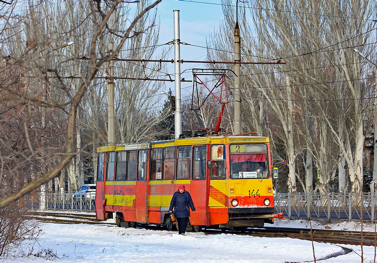 Стартует наше знакомство с этой трамвайной системой от разворотного кольца "Посёлок Рабочий", куда мы приехали на маршрутке из города. Курсируют здесь три маршрута: 2, 2а и 3. Были опасения, что ждать трамвай придётся долго, но это, к счастью, оказалось совсем не так. "Троечка" подъехала буквально сразу, в лице вагона 71-605 №144: