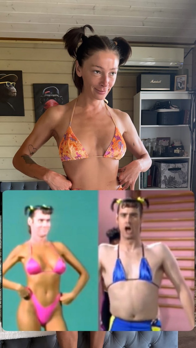 Настя Ивлеева попыталась повторить культовый образ Джима Керри в бикини из скетч-шоу In Living Color