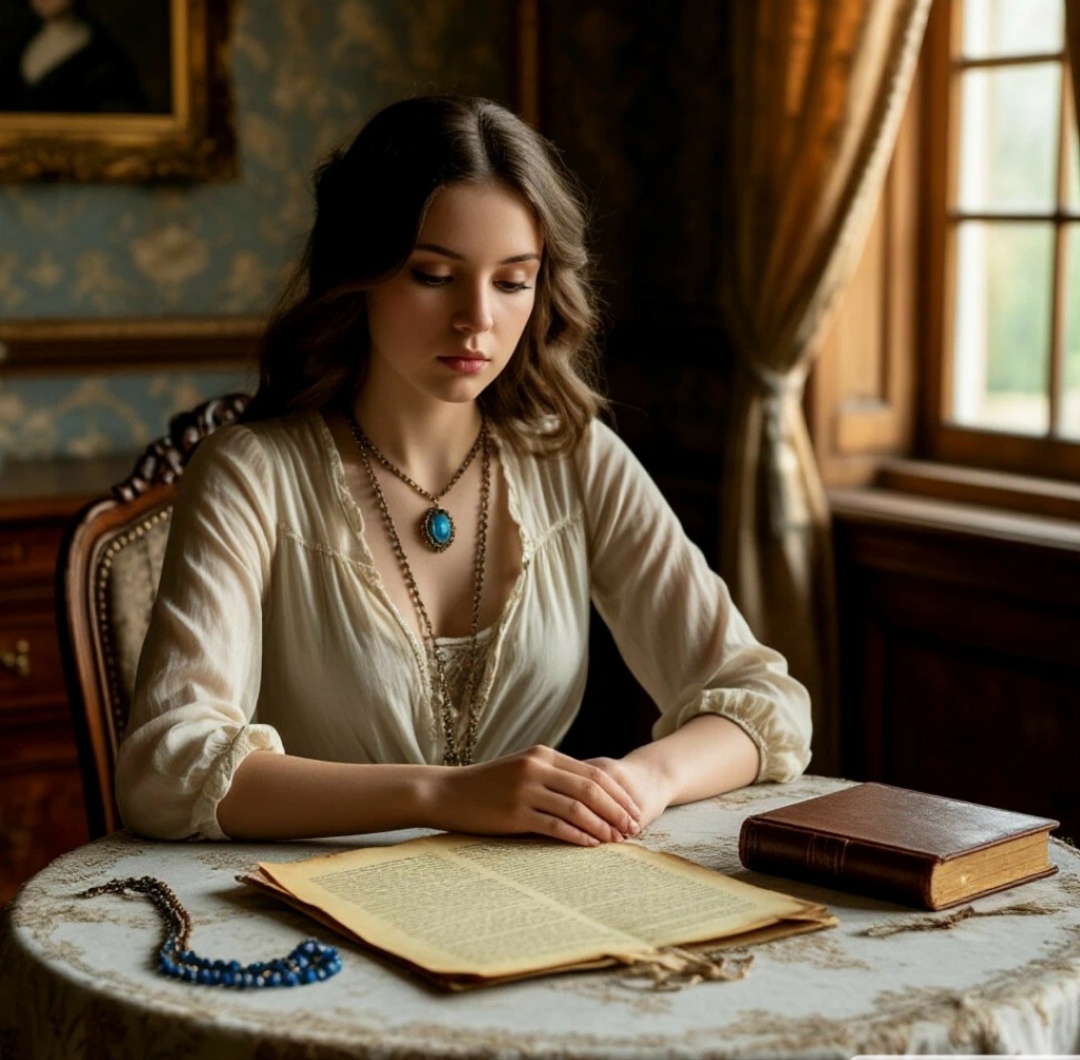 С дрожащими руками Саша открыла его. Внутри, на бархатной подкладке, лежали три предмета, словно застывшие во времени. Первым было старинное ожерелье – тонкая золотая цепочка с крупным, глубокого синего цвета камнем, который, казалось, хранил в себе отблески ночного неба. Рядом лежало пожелтевшее письмо, перевязанное выцветшей шелковой лентой. А под ним – кожаный переплет дневника. На первой странице, выведенной изящным, но твердым почерком, стояло имя: "Анна Воронцова".