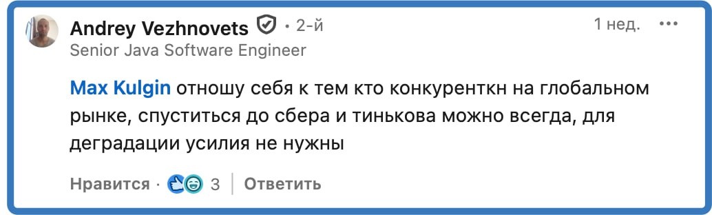 Чуть раньше этот автор написал, цитирую "...крутые не работают на РФ. Это по определению второсортная работа." - речь шла про программистов (он и сам, своего рода, программист). Но т.к. диалог не остановился, то товарищ решил уточнить про второсортную работу - см. картинку, цитирую: "...отношу себя к тем кто конкурентен на глобальном рынке, спуститься до сбера и тинькова можно всегда, для деградации усилия не нужны" Я вижу, какие продукты делают парни в Т-Банке, Сбере и т.п. - у нас цифровизация на очень высоком уровне. Ясно дело, что этот тип просто грубиян, но вижу, что не все так считают :) в комментариях, лайки ставят. И вот это удивляет. Философствую, жарко. Знаете кого он мне напоминает? Табаки, шакала из фильма Маугли, которые бегал вокруг Шер-хана и тявкал :) (мало кто знает, что его звали Табаки). Хотя даже не хочу обидеть Табаки, он милый :) Русский ИТ бизнес