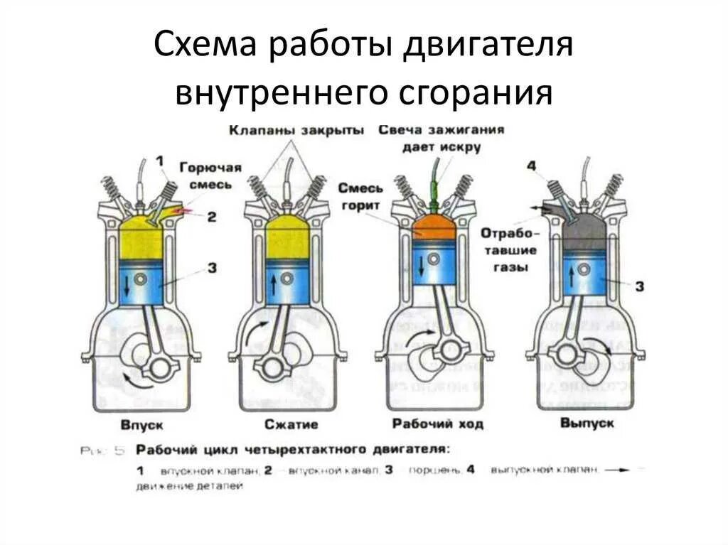 Работа ДВС включает последовательное выполнение четырёх тактов, которые могут осуществляться за разное время в зависимости от типа двигателя.