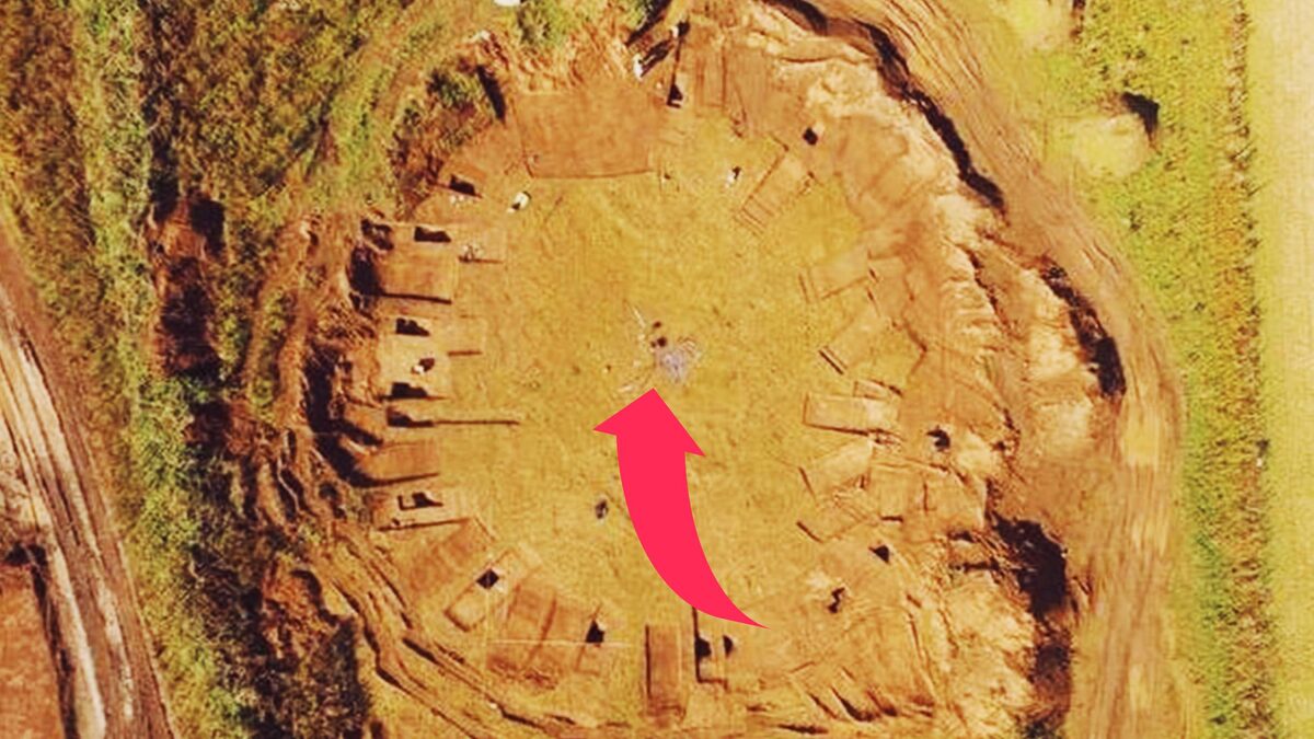 С земли не видно ничего. Обычное поле. Трактора ездят, коровы пасутся. А с воздуха - чёткий круг из тёмных пятен. Столбовые ямы. Остатки деревянной конструкции, которая четыре тысячи лет назад была крышей над головами наших предков.