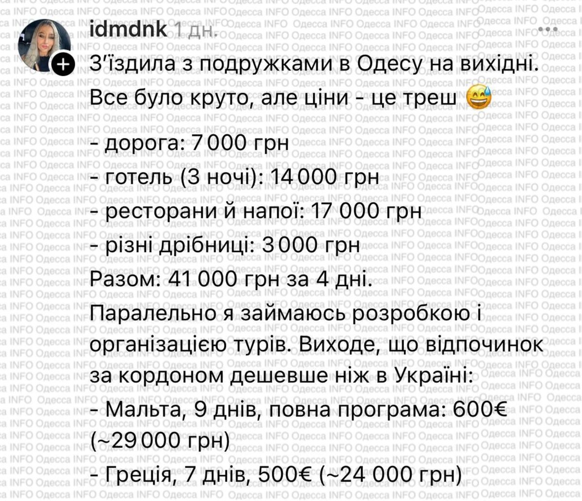 В первую очередь, жалуются на цены. Пишут, что за такие деньги можно два раза слетать в Грецию на неделю. Одна туристка посчитала цену своего отдыха в Черноморской жемчужине, и оказалось, что чек вышел на 41 тысячу гривен (80 тысяч рублей). Девушка сравнила стоимость поездки с другими вариантами, и заявила, что даже семь дней на Мальте обойдутся дешевле.