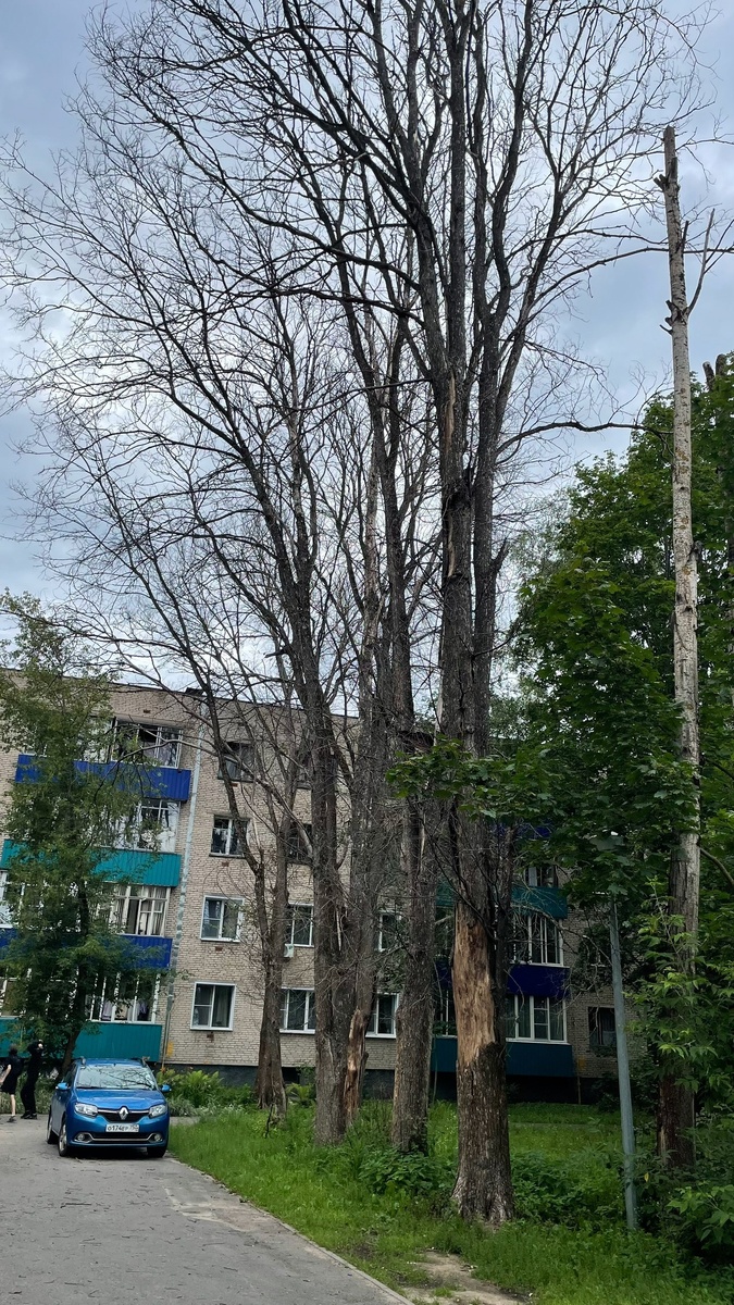 Двор на Сахарова 7а, засохшие деревья, явно требующие вырубки! Одно дерево упало весной, другое пару дней назад во время грозы