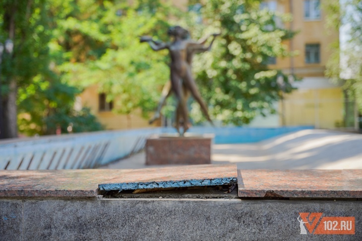Жители Волгограда вновь обратили внимание на неработающий фонтан влюбленных на улице Мира – в самом центре города. По словам волгоградцев, в разгар июльской жары сооружение, ранее бывшее настоящим оазисом свежести, продолжает разрушаться. – В минувшее воскресенье довелось быть в центре Волгограда. Присела на скамейку у фонтана возле НЭТ. Продержалась 5 минут в пекле, но зато по смотрела перед собой. Фонтан не работает, разрушается. Березы, наполовину засохшие, умирают. Скамейки и урны – рвать тянет, как выглядят, – рассказала ИА «Высота 102» жительница Волгограда Марина Федорова. – Голуби теряют сознание. Налила им водички в стакан и поспешила оттуда. Волгоградка прислала в редакцию фото, на котором голуби и впрямь выглядят умирающими. Что их привело к фонтану, который уже на протяжении нескольких лет не работает, неизвестно. Если только старая память. – И это происходит в городе на огромной реке. Миллионник. Южный форпост. Волгоград должен быть весь в фонтанах, питьевых бюветах, кафе