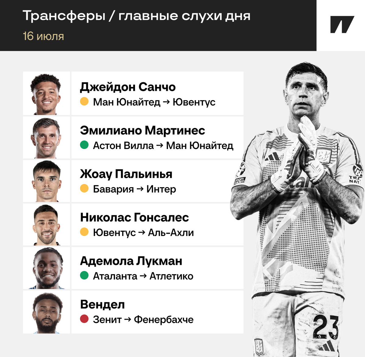 «Манчестер Юнайтед» работает над трансфером Эмилиано Мартинеса. Опережают в борьбе за аргентинского вратаря «Барселону», «Галатасарай» и клубы из Саудовской Аравии. В подписании Мартинеса заинтересован Рубен Аморим, он ценит лидерские качества. «Астон Вилла» рассчитывает на 40 млн евро, а «МЮ» хочет заплатить 33 млн.