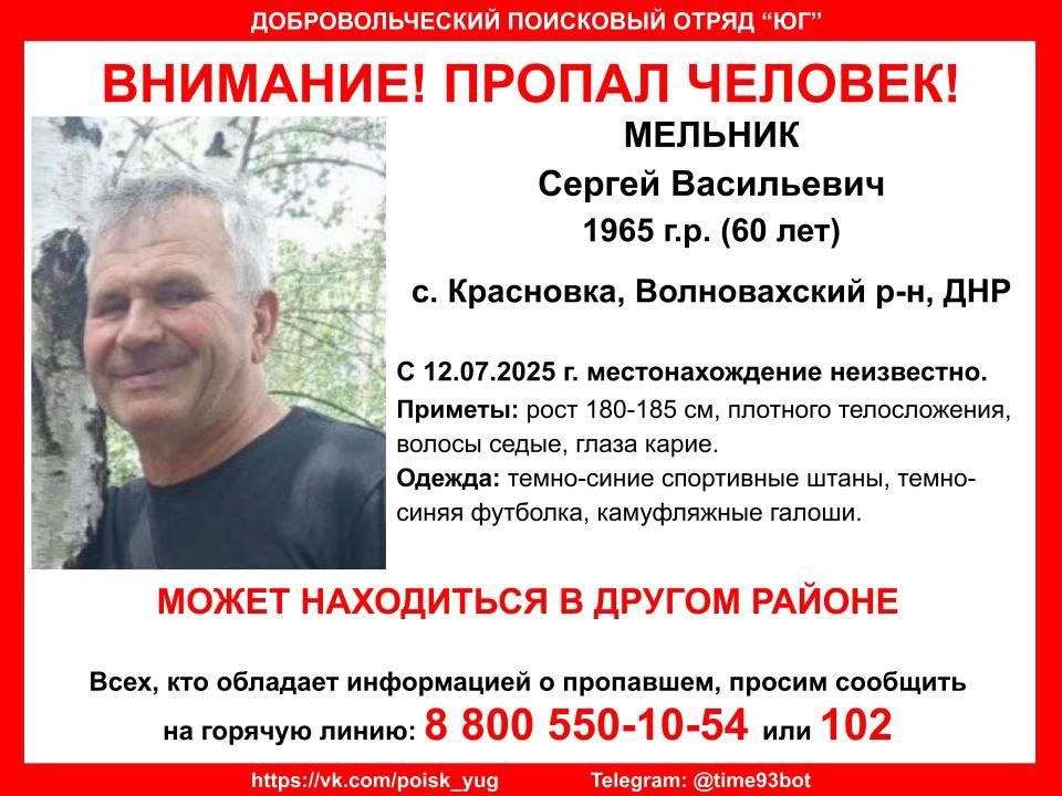 Внимание! Пропал человек! #Мельник Сергей Васильевич, 1965 г.р. (60 лет) с. #Красновка #Волновахский р-н, #ДНР С 12.07.2025 г. местонахождение неизвестно. Всех, кто обладает информацией о пропавшем, просим сообщить по телефону бесплатной горячей линии 88005501054 или 102. Если вы готовы помогать в поиске пропавших без вести, приглашаем присоединиться к телеграмм-каналу оповещения: t.me/poisk_180