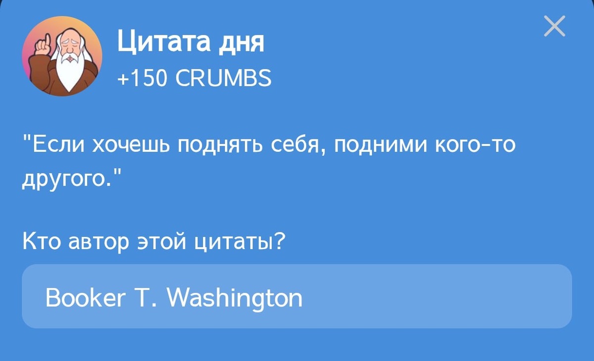 🥠 #Hrum: ЦИТАТА ДНЯ 16.07.2025 ✅ Переходим на вкладку Задачи -> Задачи ➡️ Выбираем Цитата дня ➡️ Вписываем ответ: Booker T. Washington 💰 И забираем 150 $CRUMBS 👍 если получилось Заходи в 🥠 Hrum ➡️ Старт: 29.08.2024 ➡️ Листинг: ??? 🪙 Telegram-канал Крипта для Новичков