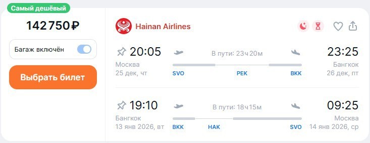В ответ на пост Китайская авиакомпания Hainan Airlines в день распродажи «Аэрофлота» никаких скидочных акций не объявляла. Просто взяла да и выложила билеты бизнес-класса Москва – Бангкок на новогодние даты за 142 тыс. руб. Наличие и цены мы смотрели в 17:30. Это, на минуточку, почти в 4 раза дешевле, чем у отечественного нацпера. Лететь на «Хайнаньских» придется с пересадками, но на стыковках можно с комфортом скоротать время в бизнес-залах аэропортов. @tourdom