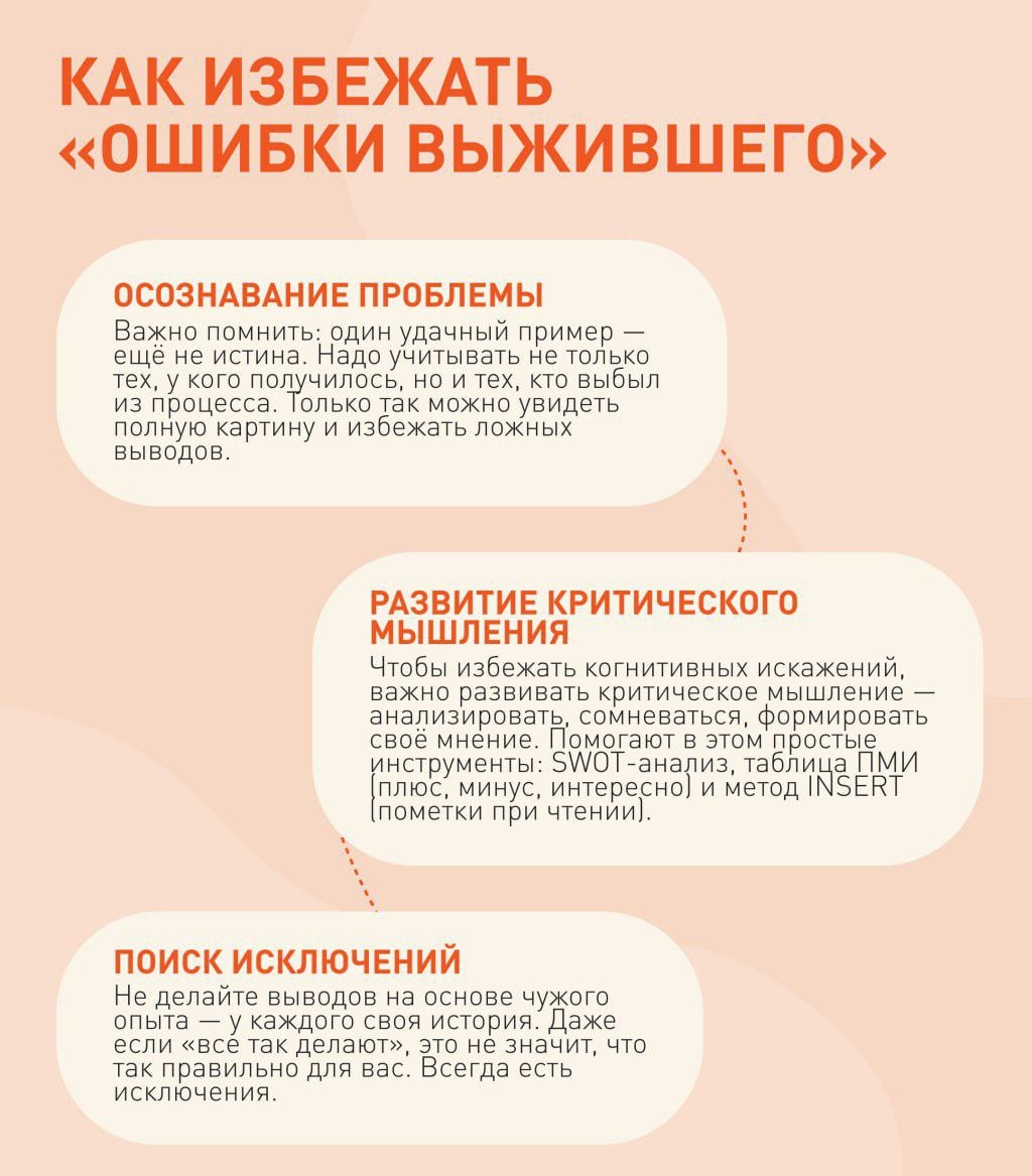 #советы ❌Ошибка выжившего: почему не стоит слепо верить чужим историям успеха «Я обычный человек, просто делал это и то — и добился успеха. Ты тоже сможешь!» — такие фразы звучат вдохновляюще, но... коварны. Почему? 📌Потому что это — ошибка выжившего. Мы видим только тех, кто «выжил», — тех, кто добился успеха. А вот сколько людей шли тем же путём и не добились ничего, мы не знаем. Их истории не попадают в блоги и заголовки. 🛩 Пример из истории: во Вторую мировую анализ повреждений возвращающихся самолётов показал, что чаще страдали крылья и фюзеляж. Логично — укрепить эти зоны? Нет. Математик Абрахам Вальд понял: те, у кого были пробиты двигатели и топливные баки, не вернулись вообще. Именно их и нужно защищать в первую очередь. Как избежать этой ошибки? Вот 3 шага.👆🏻 🎯 Главная мысль: не следуйте вслепую за «успешным успехом». Учитывайте тех, кто «не вернулся». Только тогда вы увидите всю картину. @Пинский Вестник ЮТУБ | САЙТ| ИНСТ | ВК | ОК | ФЕ | Прислать новость