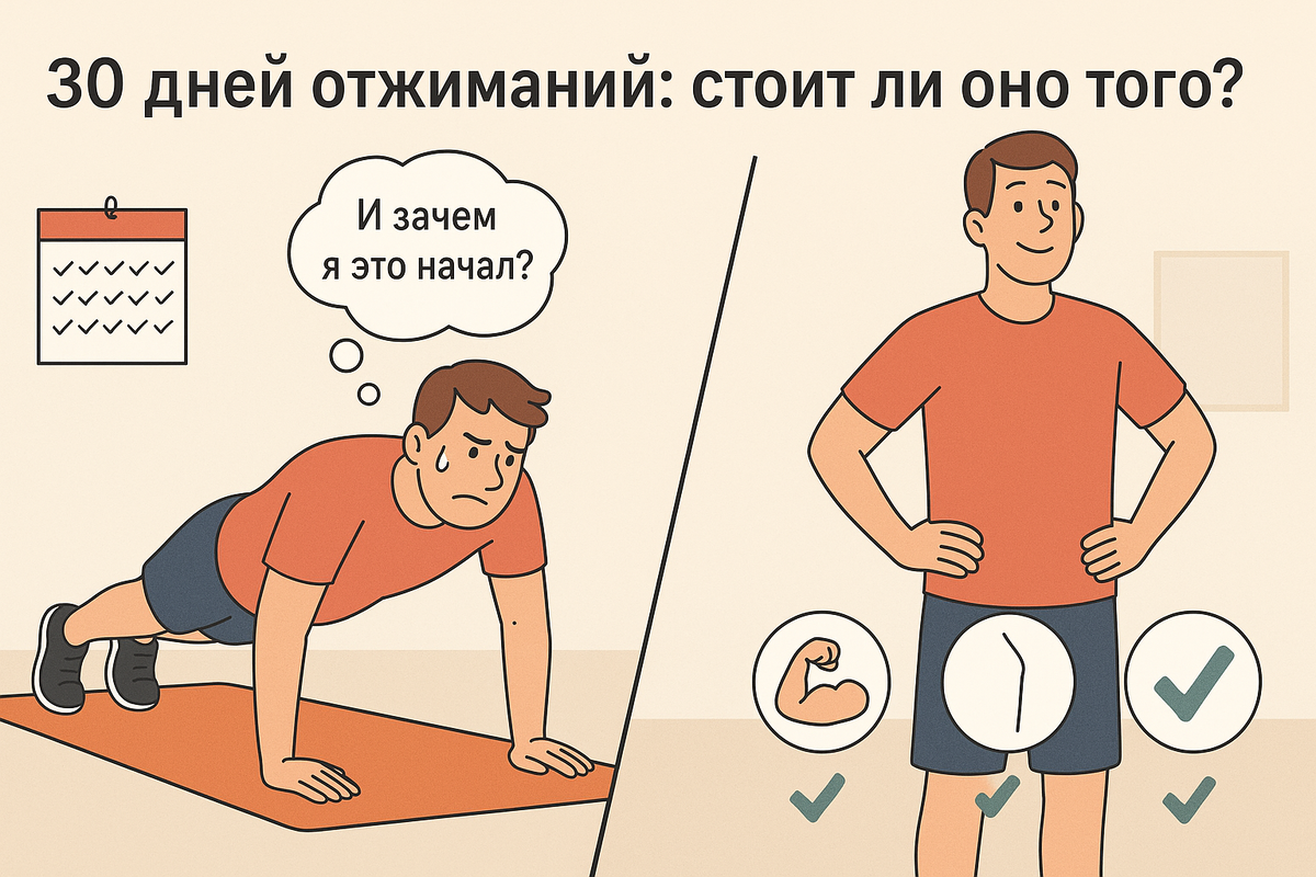 Просто решил — каждый день делать отжимания. Без пропусков. Без оправданий. 30 дней. Почему? Потому что, как и многие, хотел почувствовать в теле уверенность, не ломая себя.