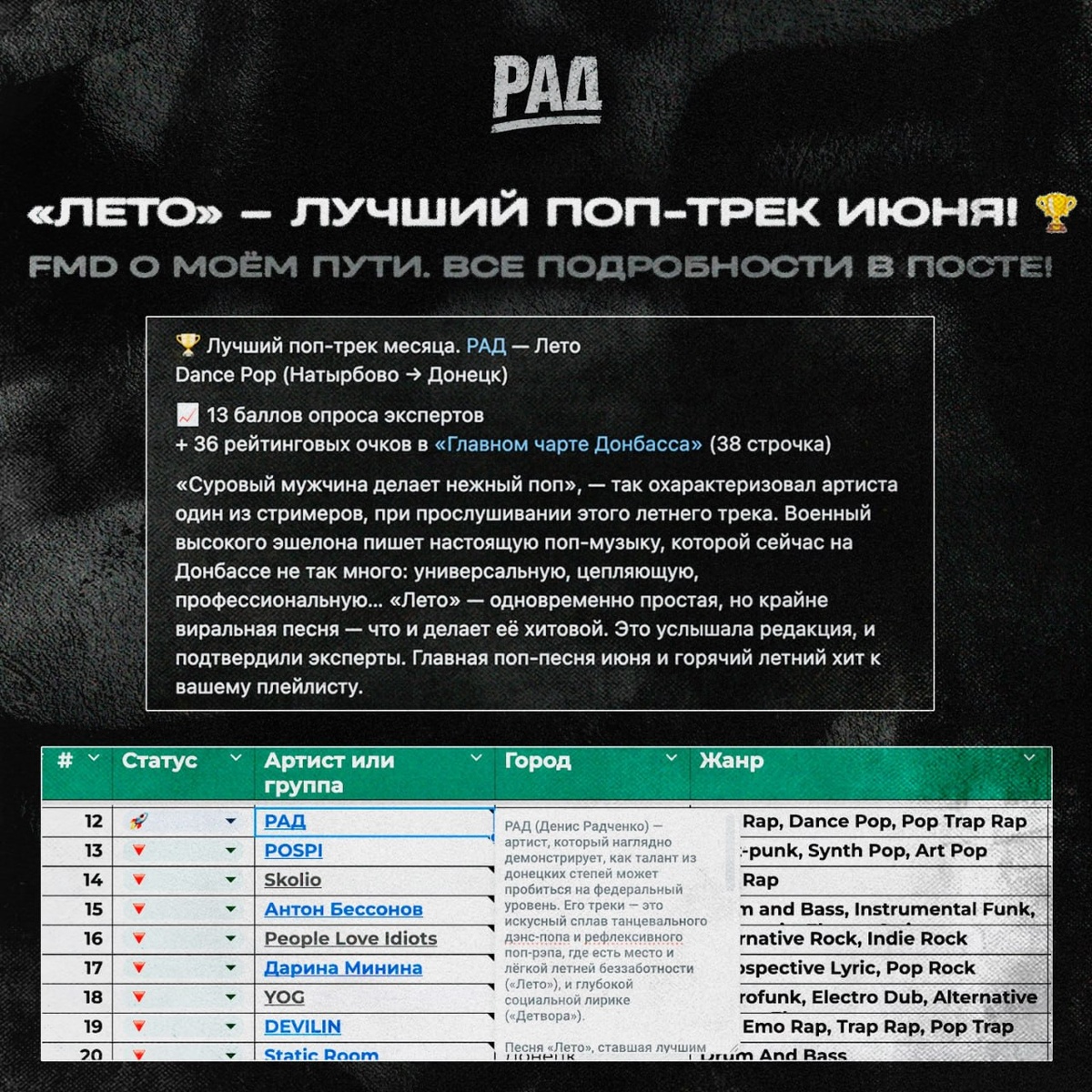 Музыкальный журнал Famous Music Донбасс @famous_music_donbass включил меня в свою «Энциклопедию музыкантов Донбасса», рассказав о моём пути. А трек «Лето» признали «Лучшим поп-треком июня». Особенно зацепила одна фраза от редакторов: «Артист, который наглядно демонстрирует, как талант из донецких степей может пробиться на федеральный уровень». Для меня это очень важные слова. Я всегда верил, что неважно, откуда ты, главное — делать своё дело от души. И ваша поддержка это доказывает. Спасибо FMD за признание! И спасибо каждому из вас, что вы со мной на этом пути 🙏 Это только начало.