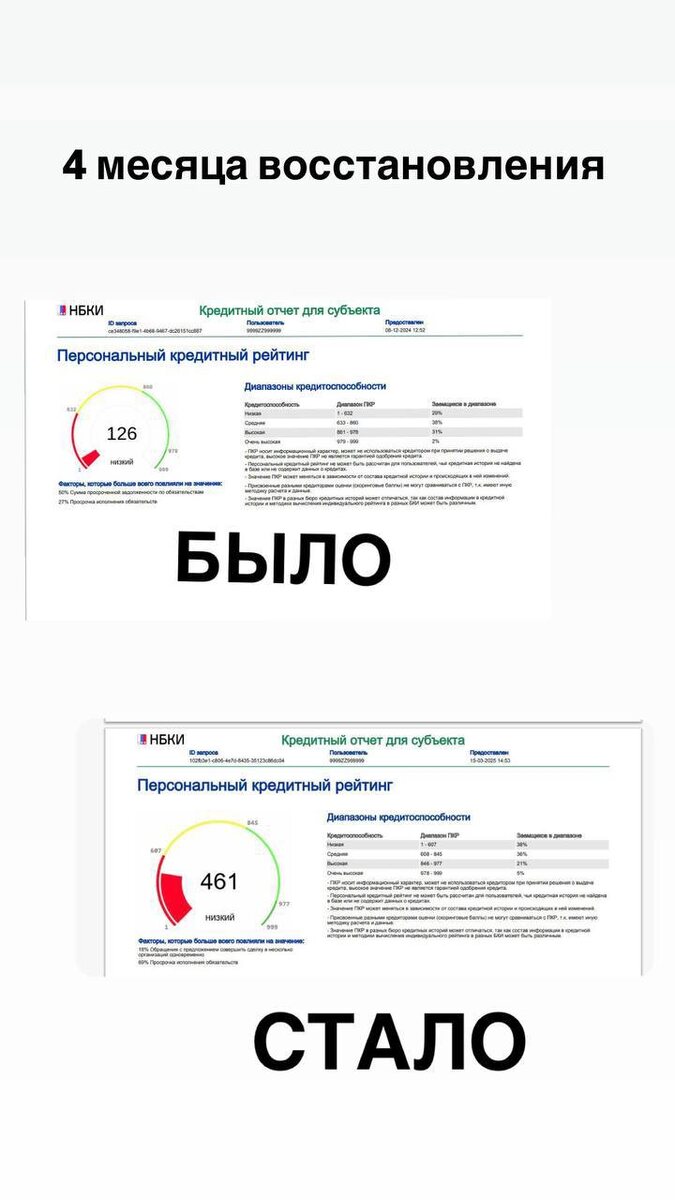 Как мы восстанавливаем кредитную историю — на реальных примерах Фотографии и кейсы, которые вы видите выше — это промежуточные результаты наших клиентов. У каждого — своя история: Кто-то не заплатил вовремя, Кто-то «завяз» в МФО, У кого-то рухнул бизнес. Но всех их объединяет одно — желание восстановить кредитную историю, чтобы снова иметь возможность брать кредиты, ипотеки, автокредиты. Кейс 1. Восстановление после МФО и просрочек Клиент: Мансур — Рейтинг на момент обращения: 126 НБКИ — Через 4 месяца работы: 461 НБКИ — Ещё месяц спустя: первый одобренный кредитный продукт Кейс 2. Бесплатные рекомендации → +2,9 млн ₽ Клиент: Александр — Рейтинг на момент обращения: 720 (Скоринг Бюро) — Через 4 месяца: 874 Скоринг Бюро — Спустя неделю: одобрение кредита 2,9 млн ₽ Это лишь малая часть наших кейсов по восстановлению КИ. Хотите узнать, как проходит восстановление кредитной истории и что оно из себя представляет? Прослушайте следующее голосовое сообщение — там расскажем простыми слова