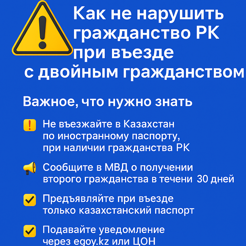 ⚠️ Как не нарушить гражданство РК при въезде с двойным гражданством: важное, что нужно знать в 2025 году Гражданство Казахстана и въезд с иностранным паспортом: что грозит и как избежать проблем? Многие граждане Республики Казахстан, уехав за границу, получают второе гражданство — чаще всего российское, немецкое, американское или турецкое. Однако при возвращении в Казахстан их могут ждать серьёзные юридические последствия. Чтобы не нарушать Закон о гражданстве РК, нужно чётко понимать, какие действия считаются правонарушением, и что грозит за сокрытие второго гражданства. ✅Основные положения законодательства РК о гражданстве Согласно Закону Республики Казахстан «О гражданстве»: Казахстан не признаёт двойное гражданство (статья 3 закона от 20 декабря 1991 года № 1017-XII). Получение второго гражданства без уведомления влечёт административную и даже уголовную ответственность. При въезде в РК гражданин обязан использовать только казахстанский паспорт. 📌Важно: если вы въехали в Казахстан